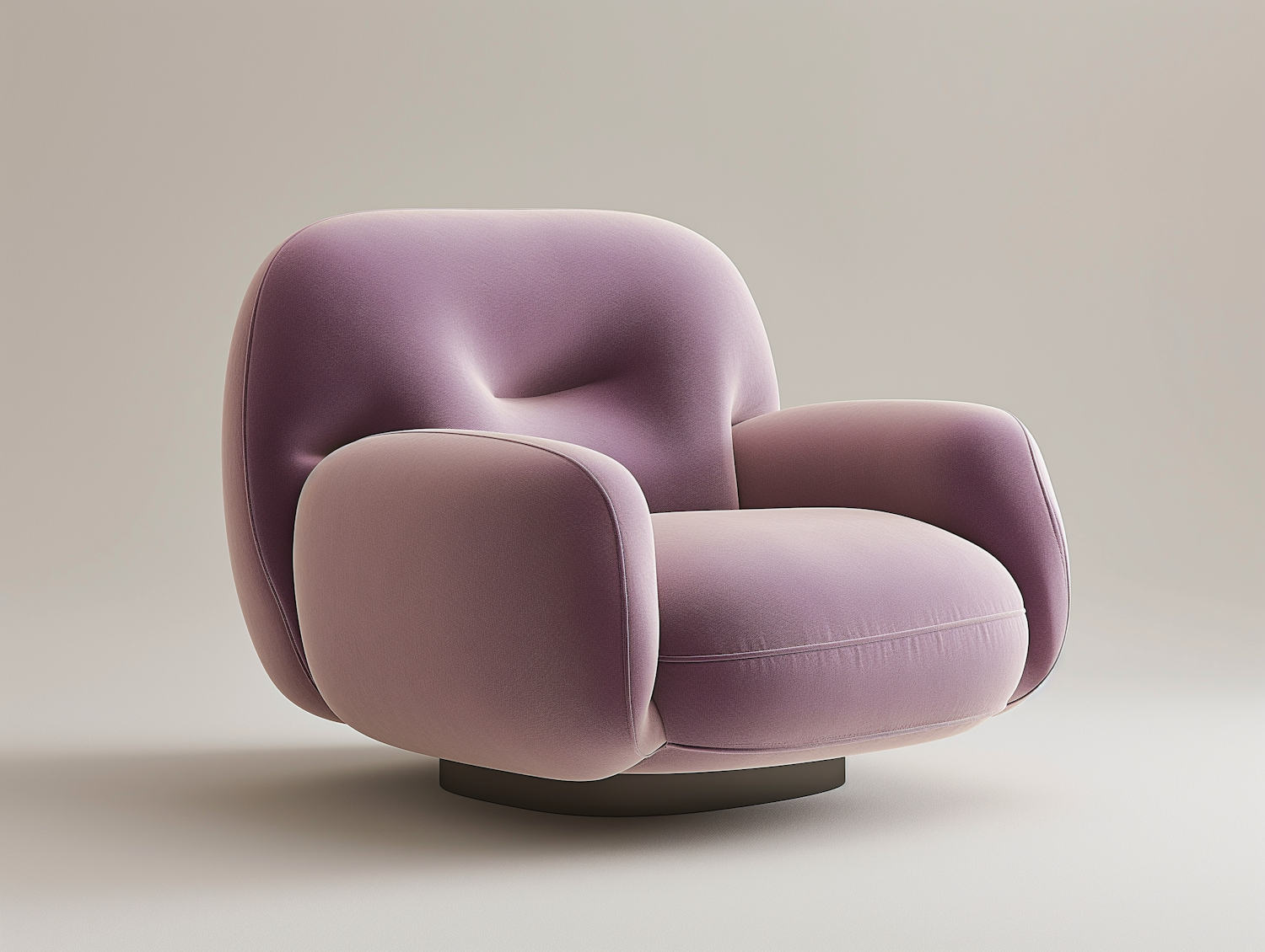 Luxurious lavender armchair with plush, rounded design and subtle tufting, perfect for modern interiors.