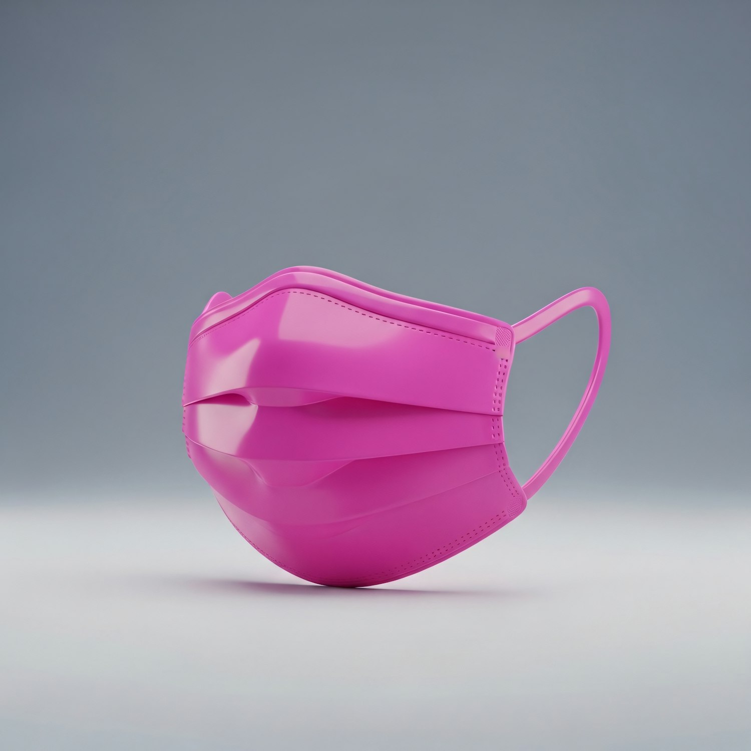 A sleek pink face mask with a glossy finish, displayed against a neutral gray background, showcasing its modern and polished design.