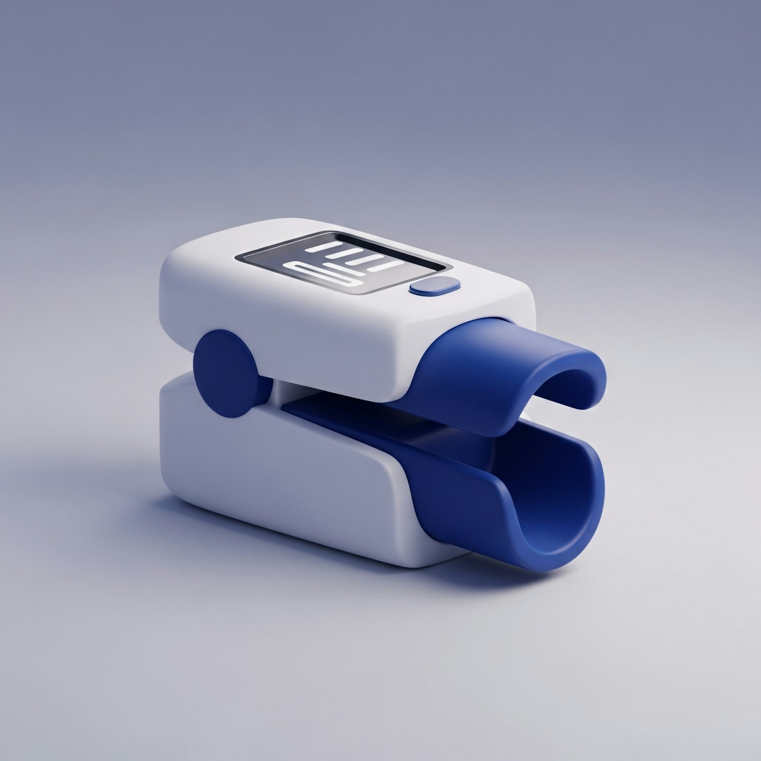 A modern white and blue pulse oximeter with a digital display, designed for comfort and accuracy, set against a clean gradient background.