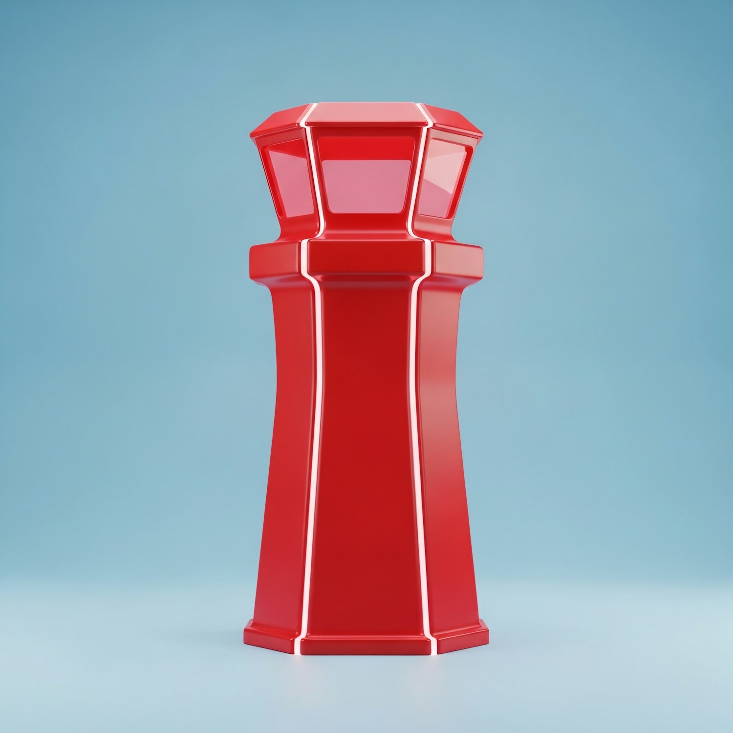 A modern red lighthouse-shaped object with white accents and a glossy finish, set against a clean light blue background.