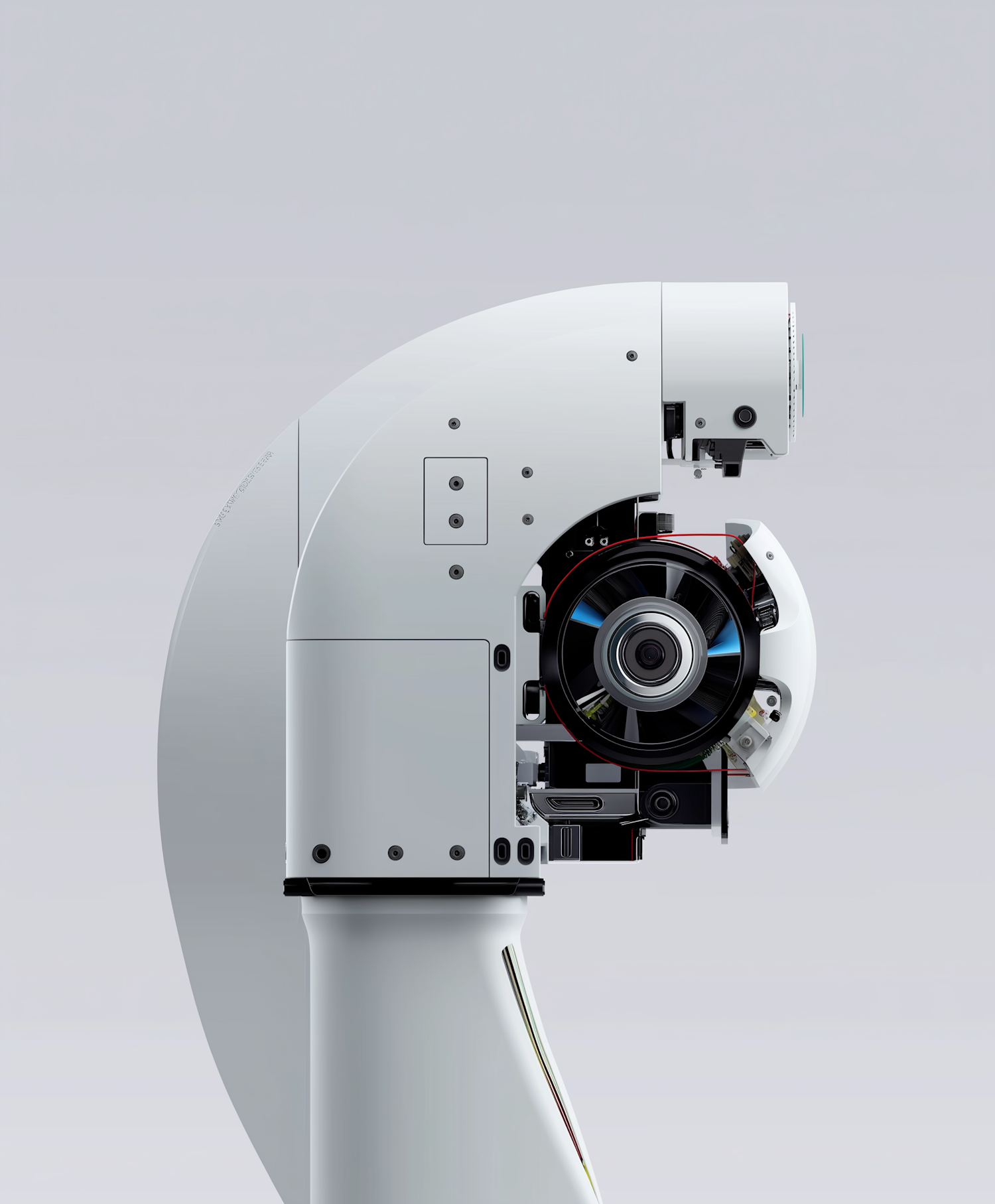 A futuristic robotic arm with a white exterior and exposed internal components, showcasing intricate mechanical design.