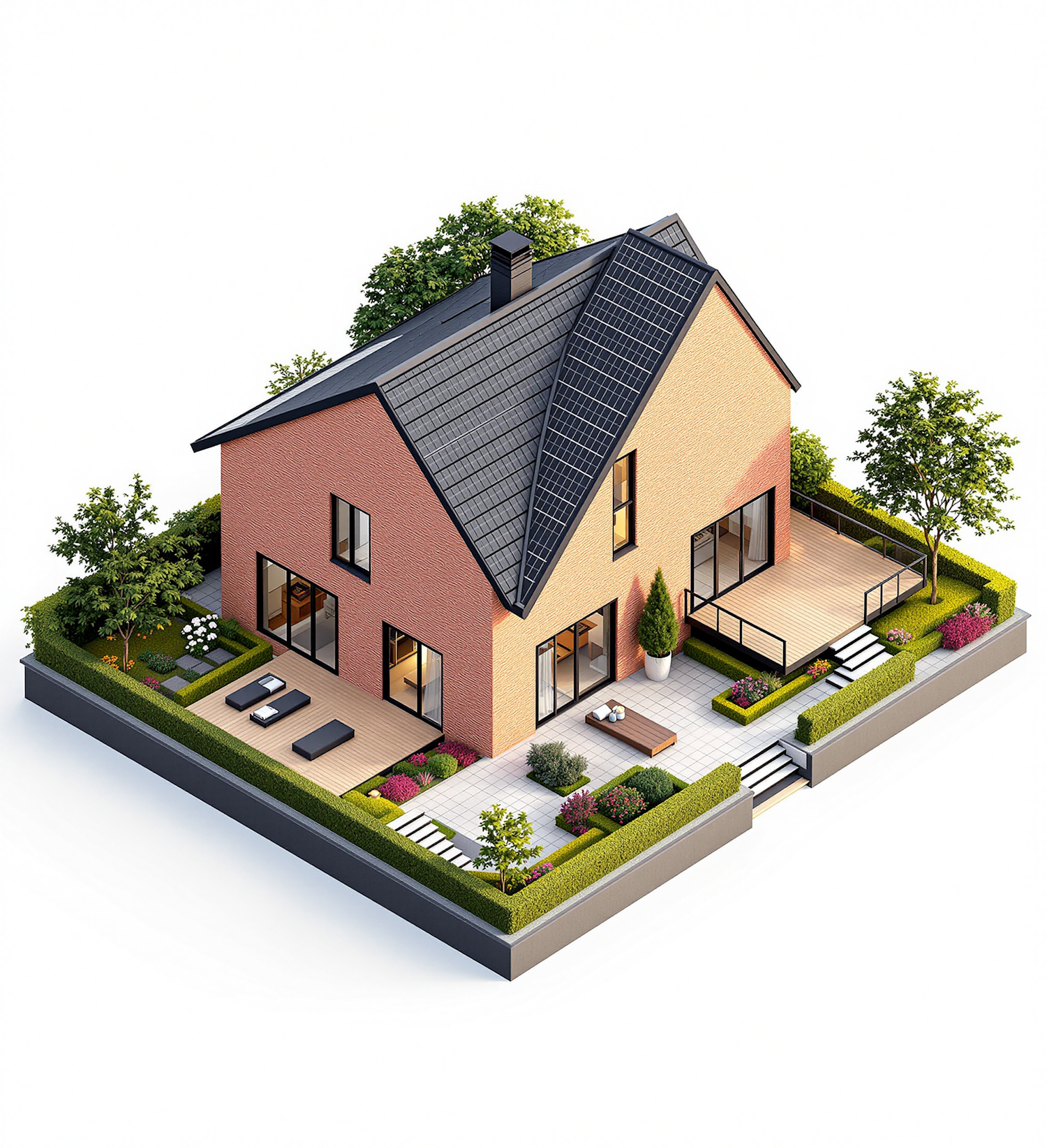 Modern 3D-rendered house with solar panels, large windows, and a landscaped garden featuring a deck and patio. Perfect for eco-living ideas.