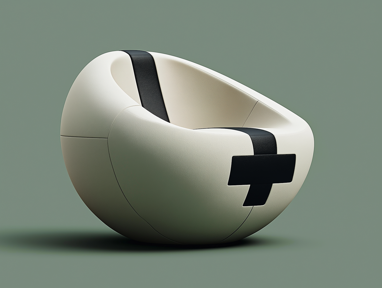 Sleek spherical chair with off-white leather texture and bold black accents, perfect for modern minimalist interiors.
