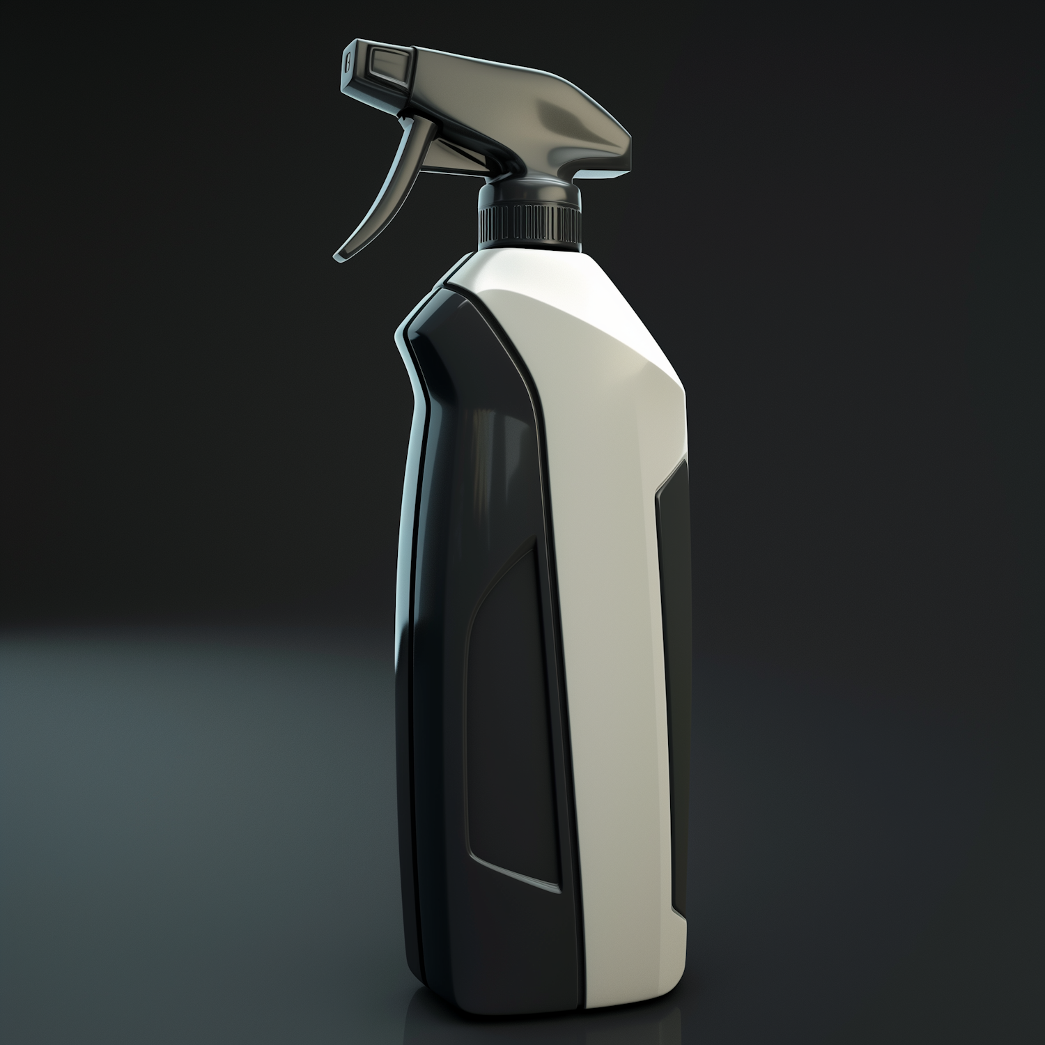 Modern black and white spray bottle with a sleek design, ergonomic grip, and glossy finish, set against a dark gradient background.