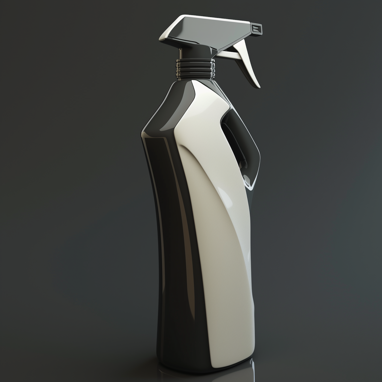 Modern black and white spray bottle with a sleek, glossy design and curved surfaces, perfect for cleaning or cosmetic products.