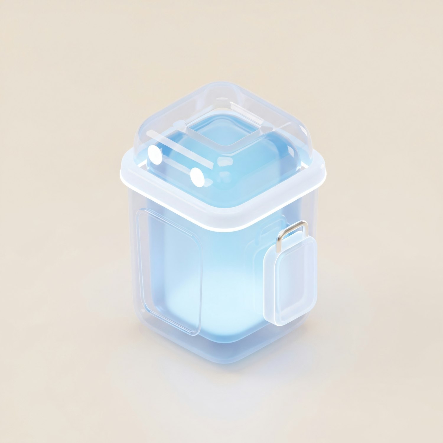 A modern, transparent plastic container with a blue tint and white lid, featuring a secure latch and sleek design, perfect for storage.