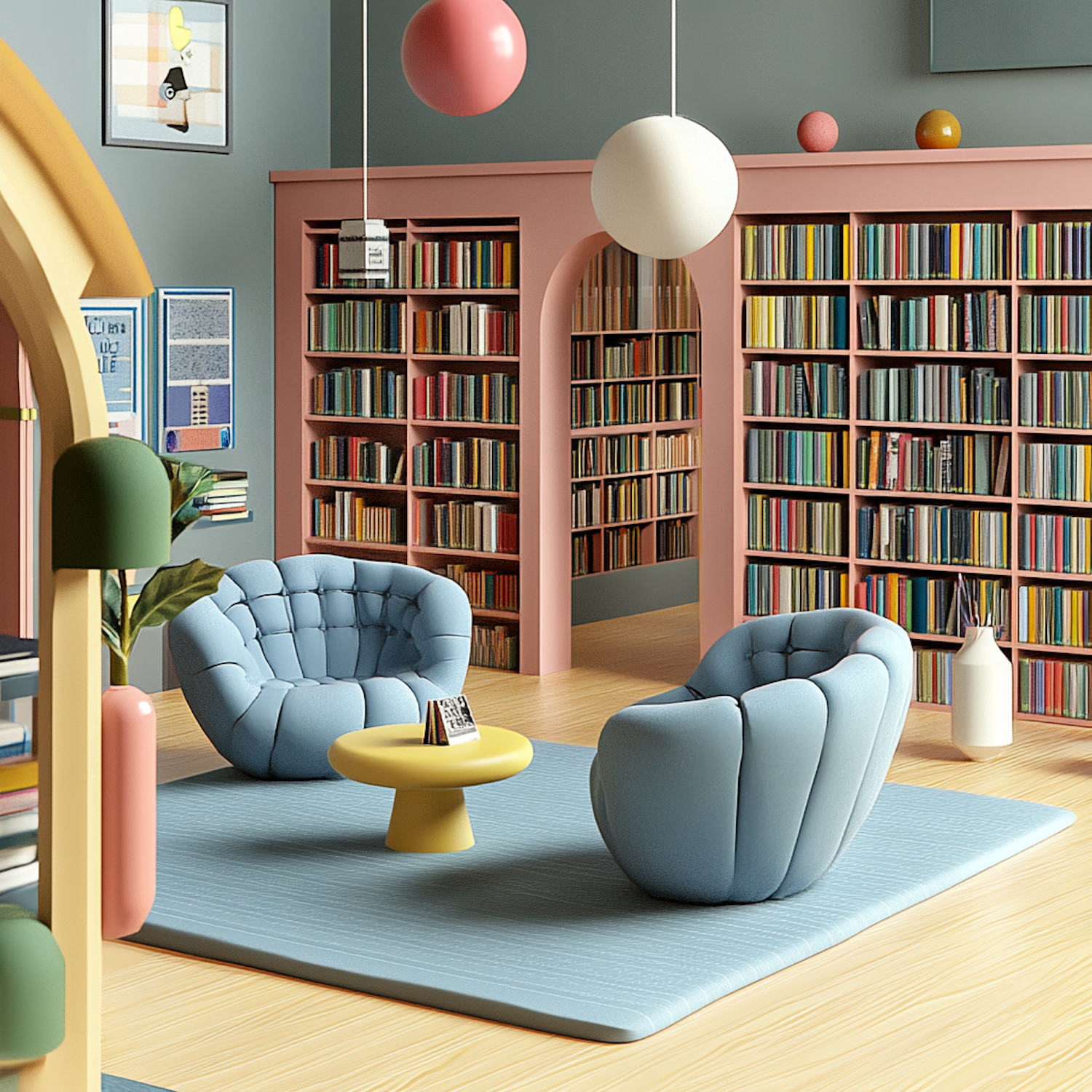 Modern library with pastel decor, featuring plush blue chairs, a yellow table, and colorful bookshelves under soft lighting.