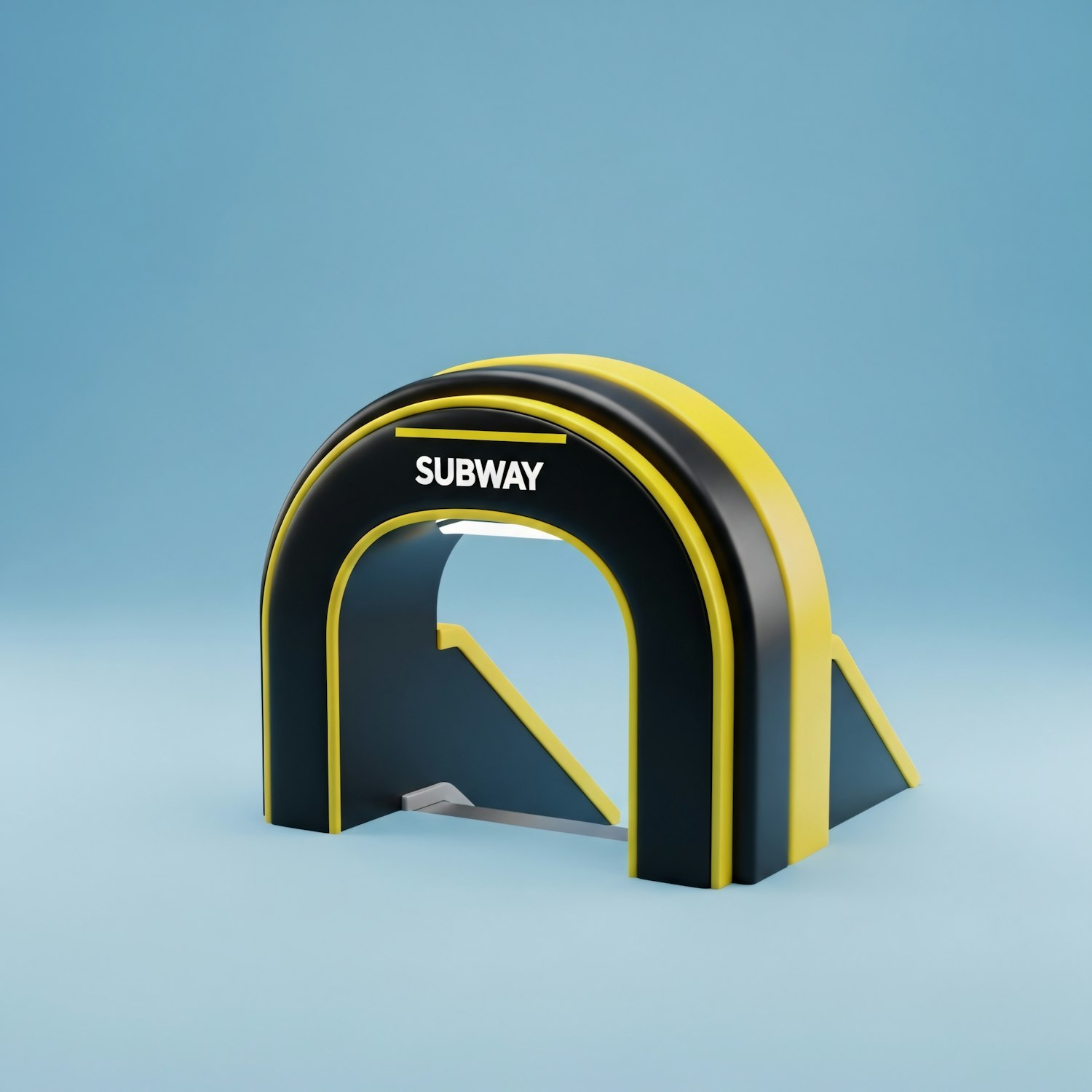 A modern 3D model of a subway entrance with a black and yellow arch design, set against a clean light blue background.