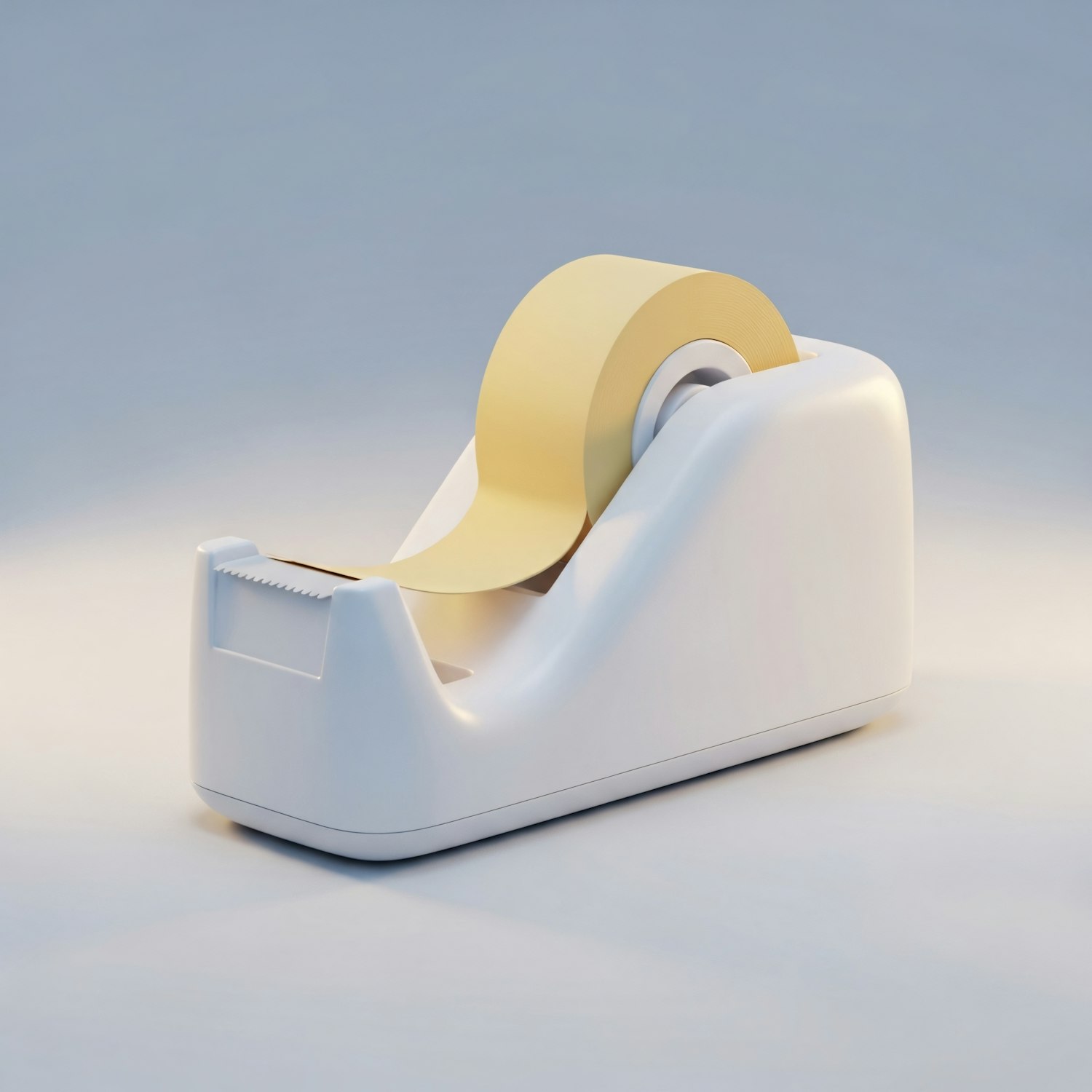A modern white tape dispenser with beige tape, set against a clean gradient background, showcasing its sleek and functional design.