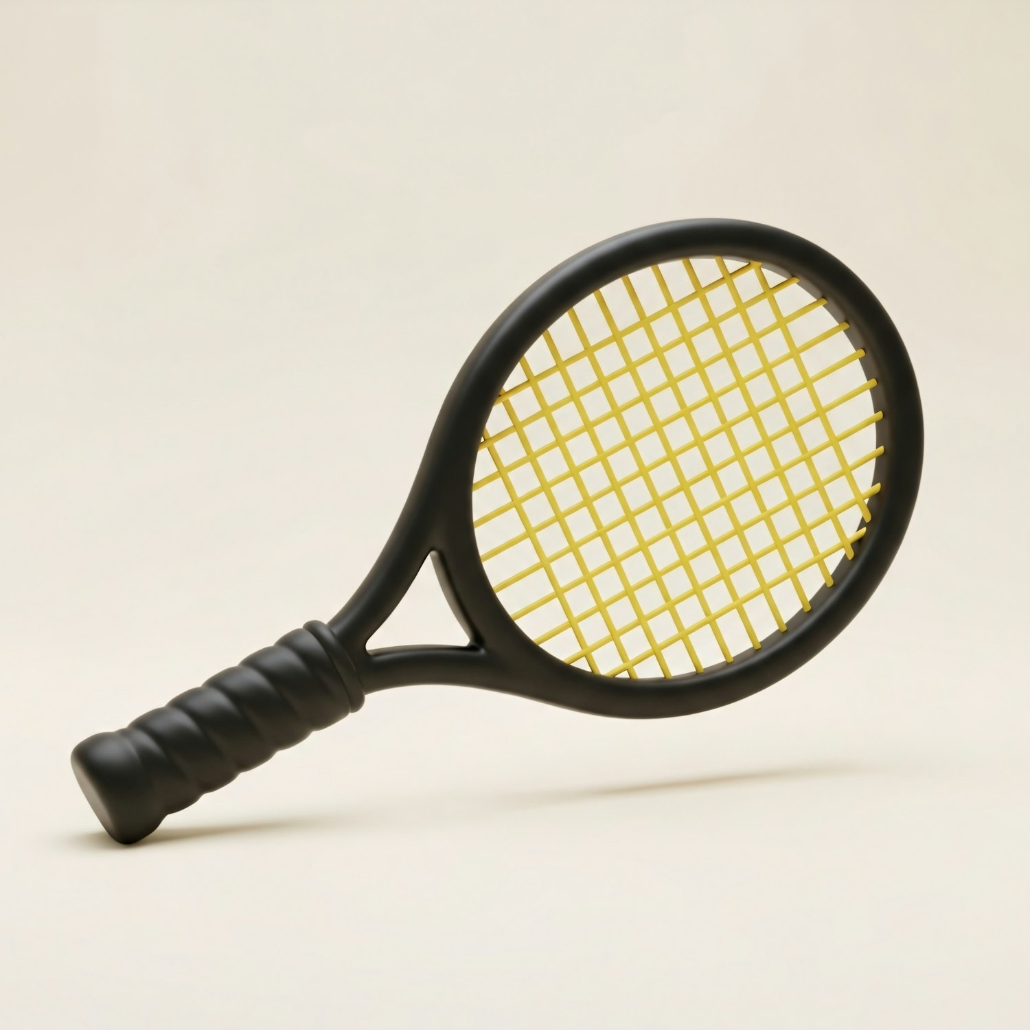 A sleek black tennis racket with yellow strings on a neutral background, showcasing its modern design and textured grip.