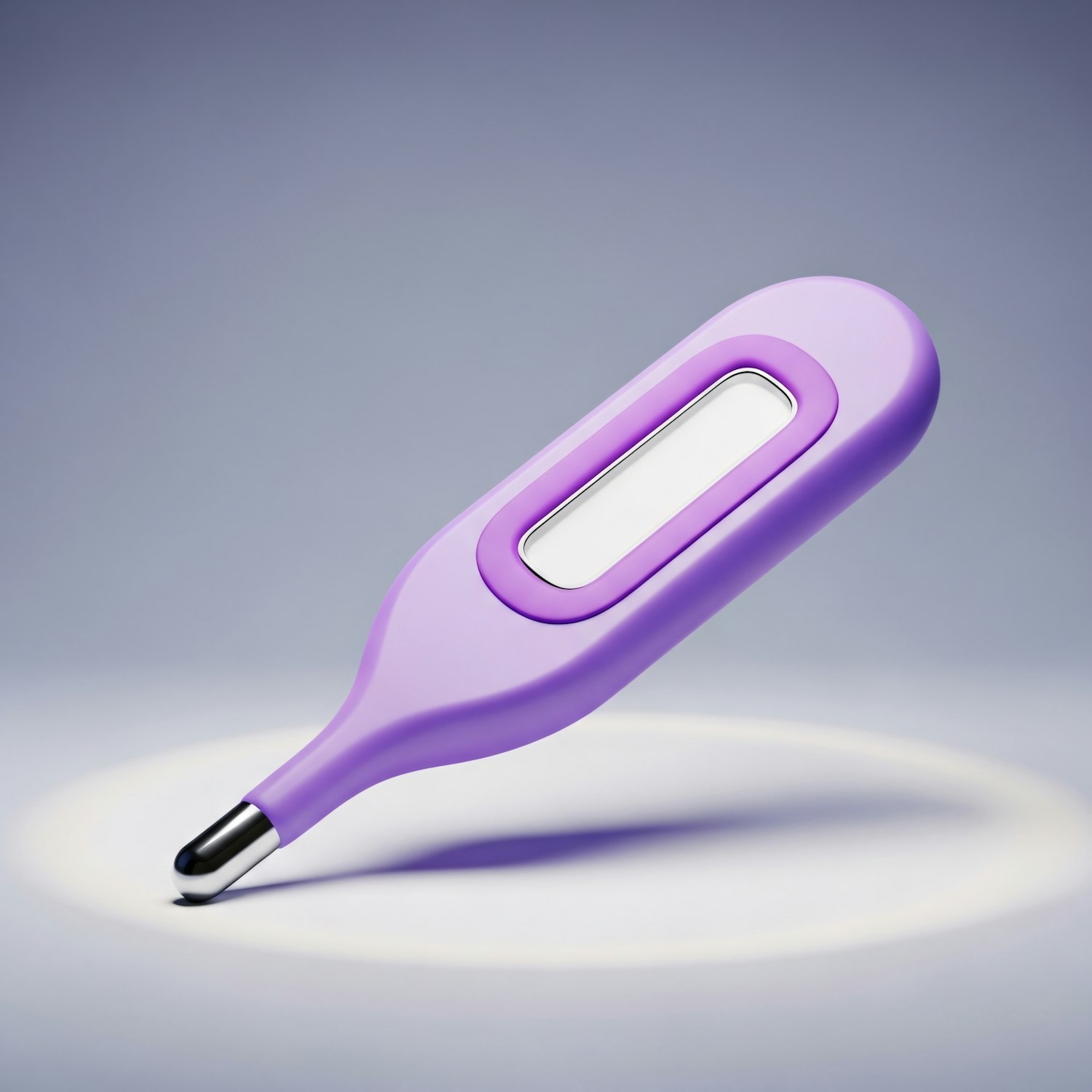 A modern purple thermometer with a digital display and metallic tip, set against a clean gradient background.