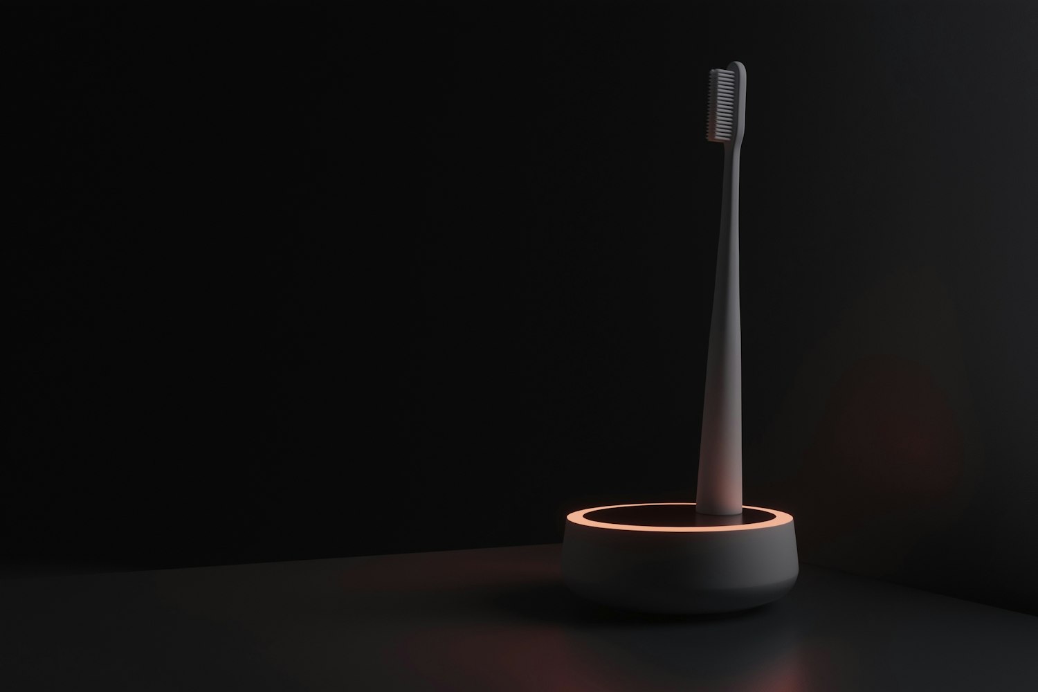 Sleek electric toothbrush in a glowing holder against a dark background, highlighting modern design and elegance.