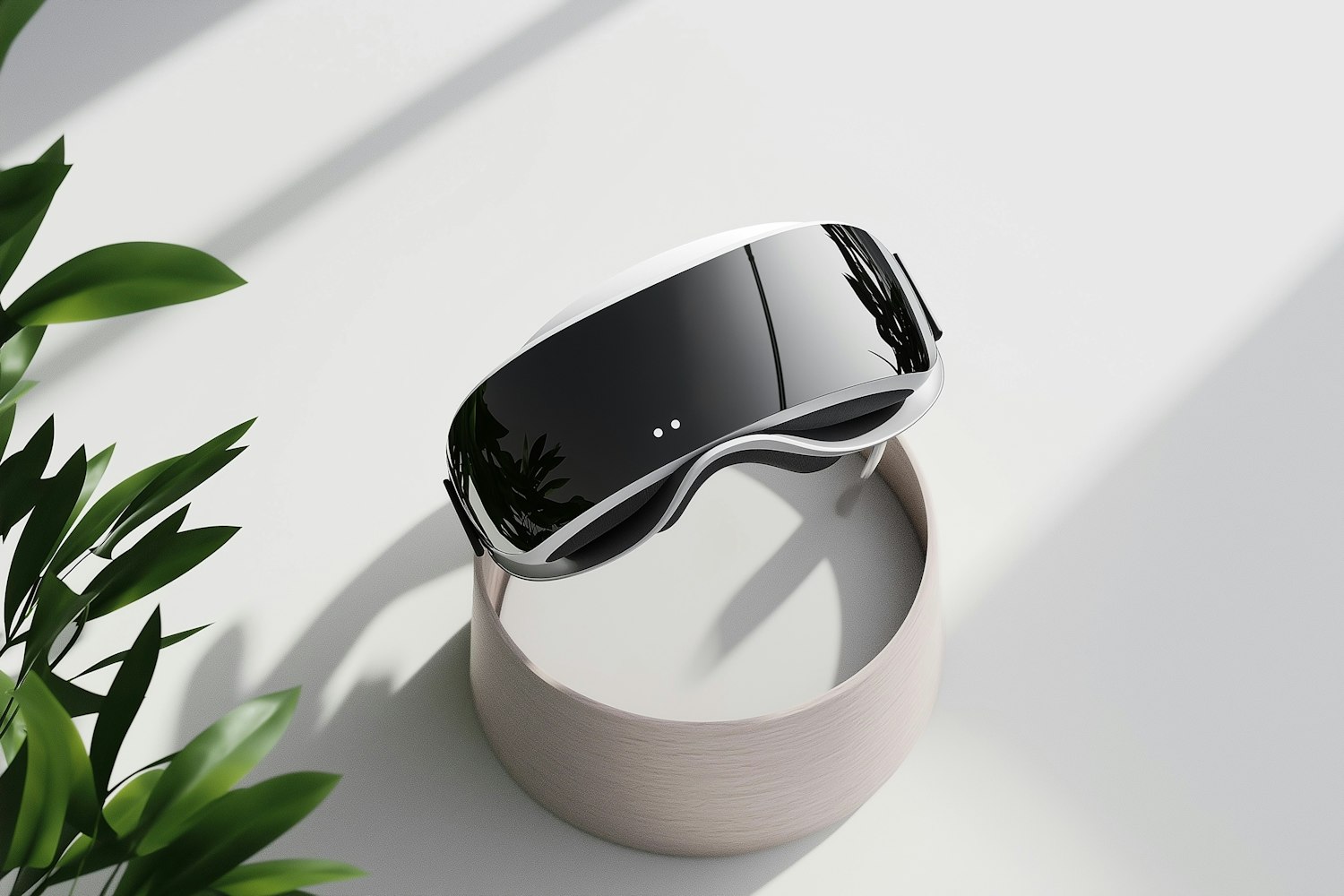 Sleek VR headset with glossy black visor on a wooden surface, surrounded by minimalistic decor and green plant shadows.