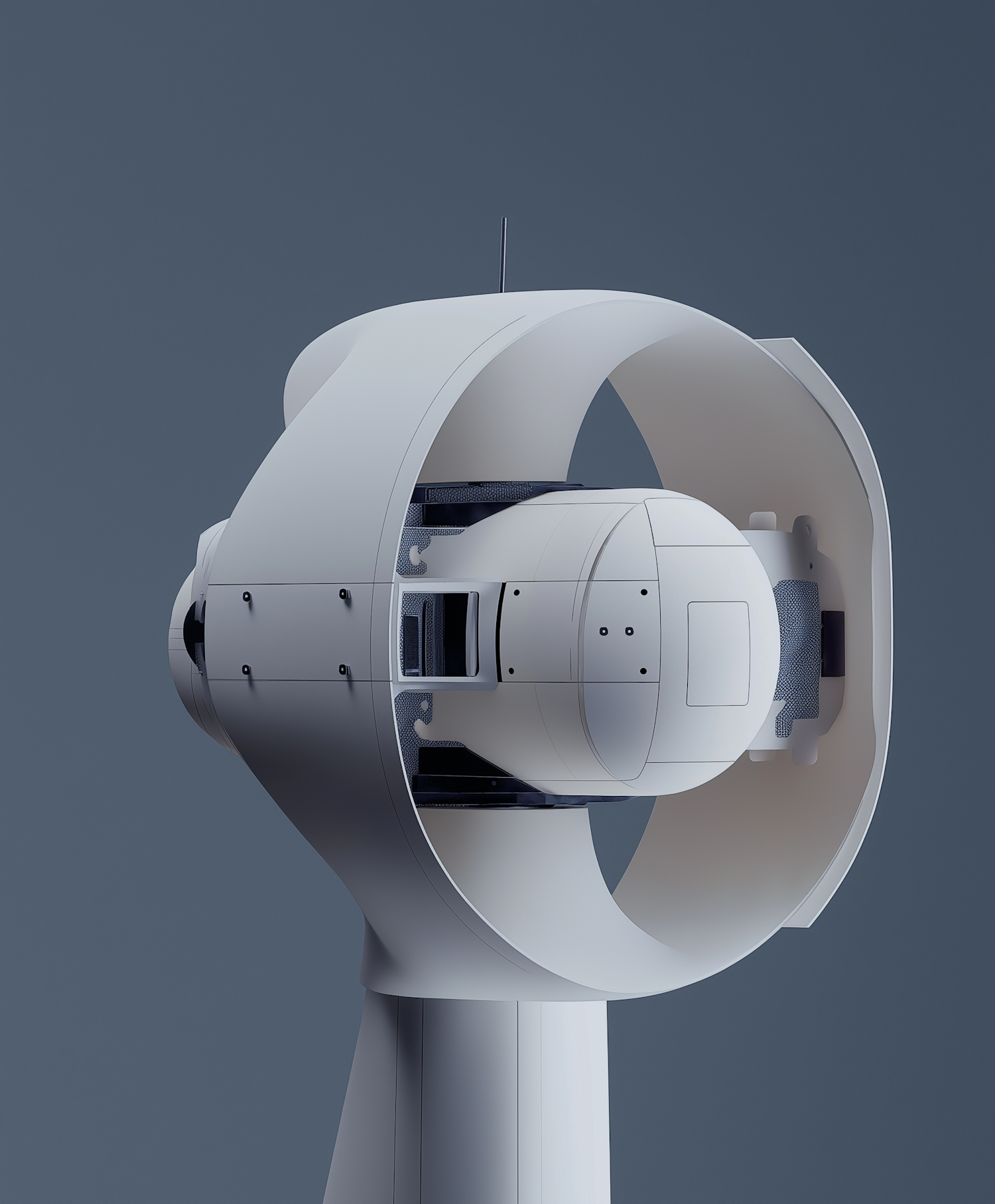 Close-up of a futuristic wind turbine nacelle with a sleek, aerodynamic design against a clean blue background.