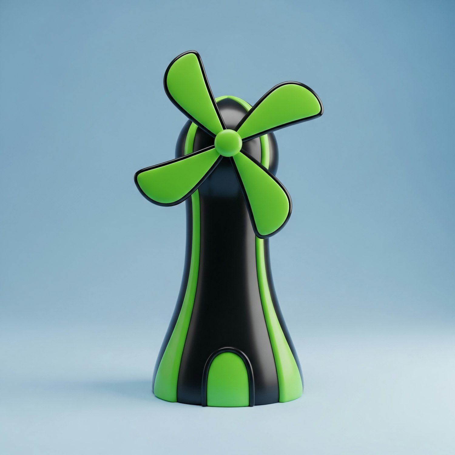A sleek, modern windmill design with black and green accents, set against a gradient blue background, showcasing a futuristic aesthetic.