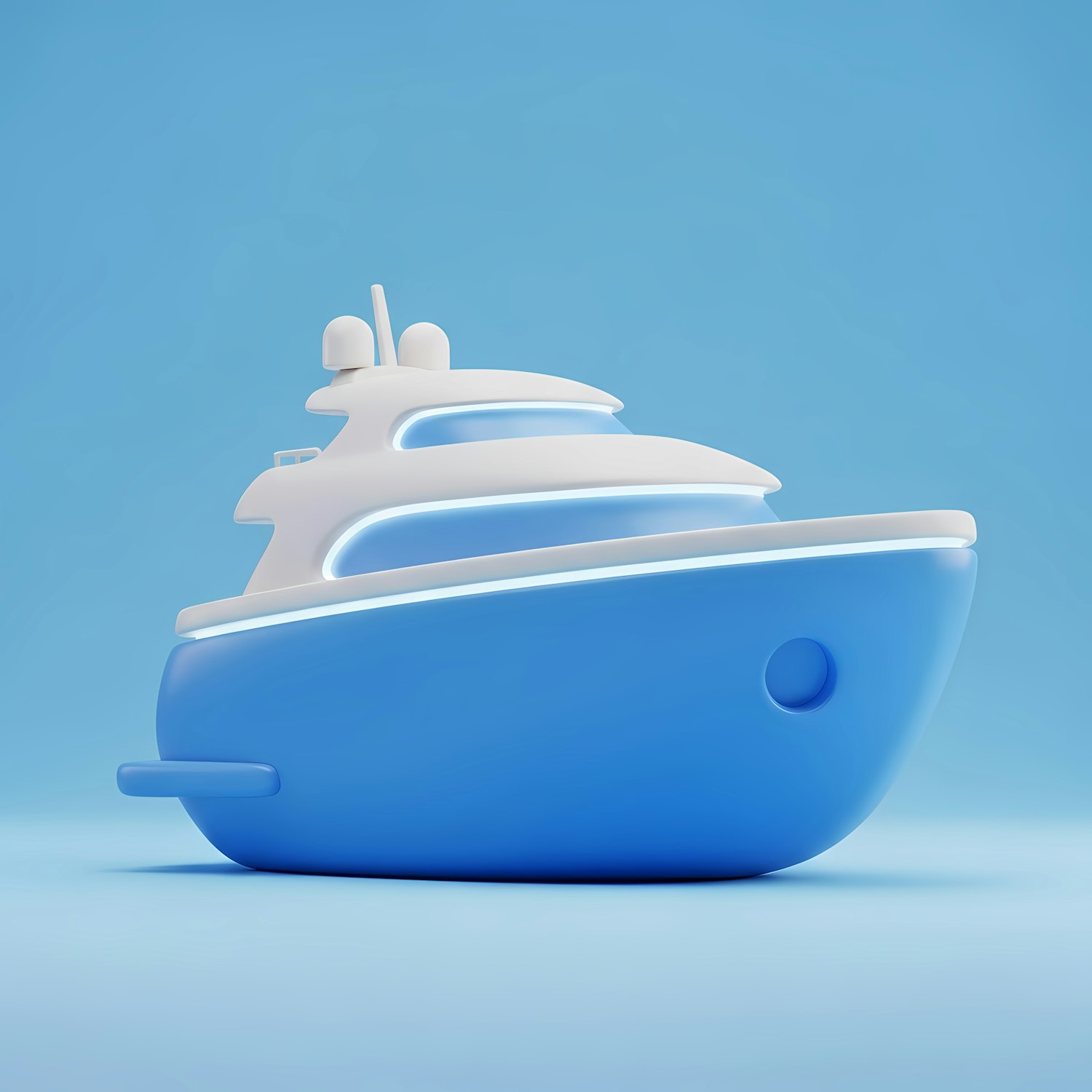 Minimalistic 3D illustration of a modern yacht with a white and blue design against a light blue background.