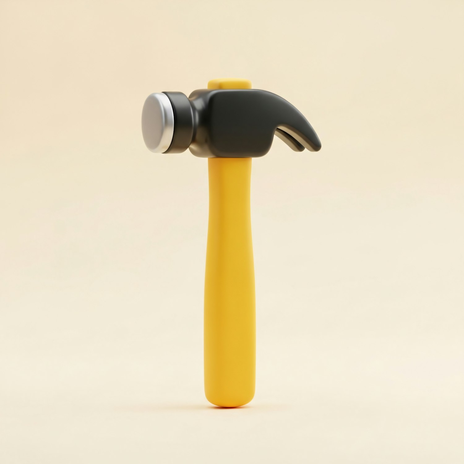 A modern, stylized hammer with a yellow handle and black head, set against a neutral beige background.