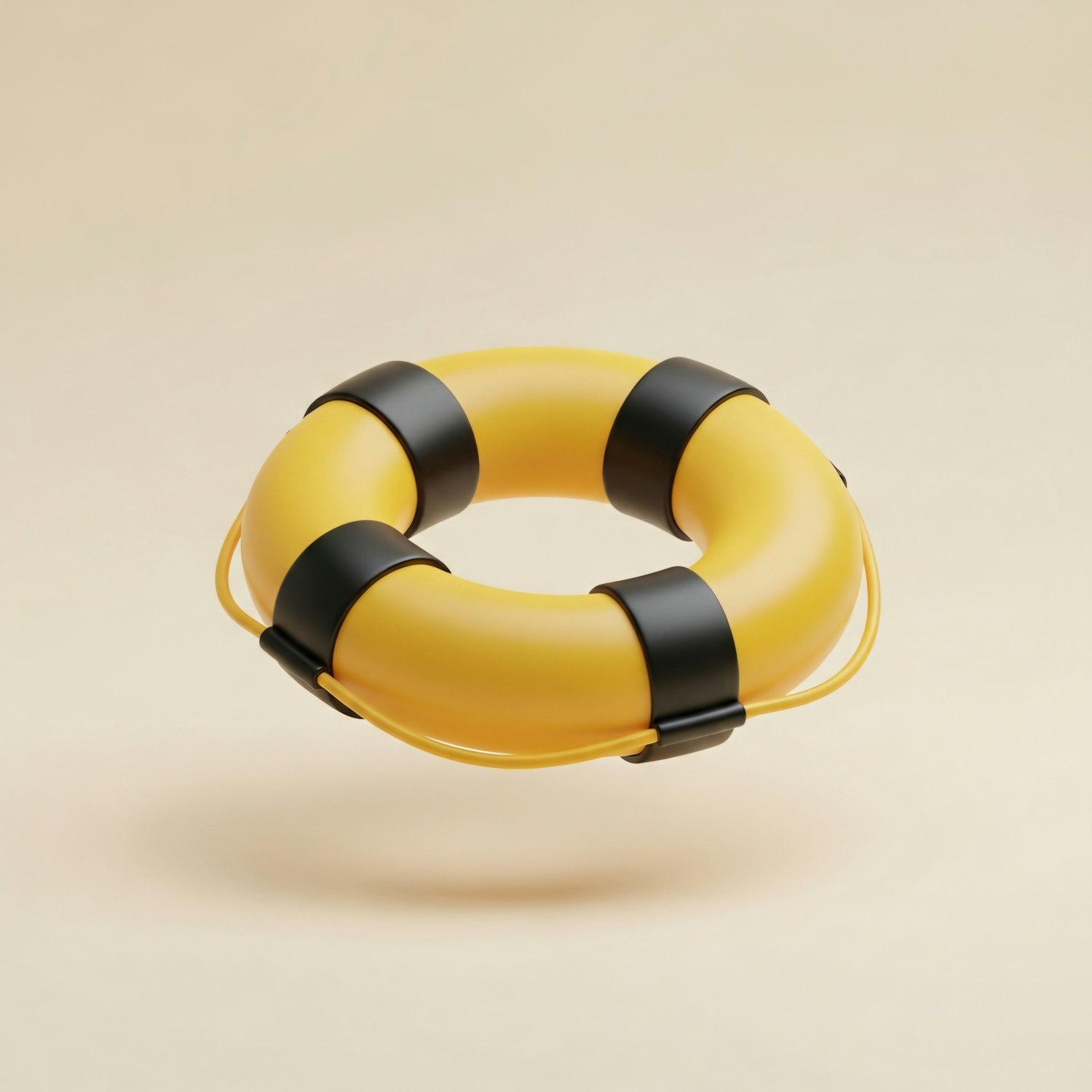 A modern yellow lifebuoy with black straps, floating against a beige background, showcasing a sleek and minimalistic design.