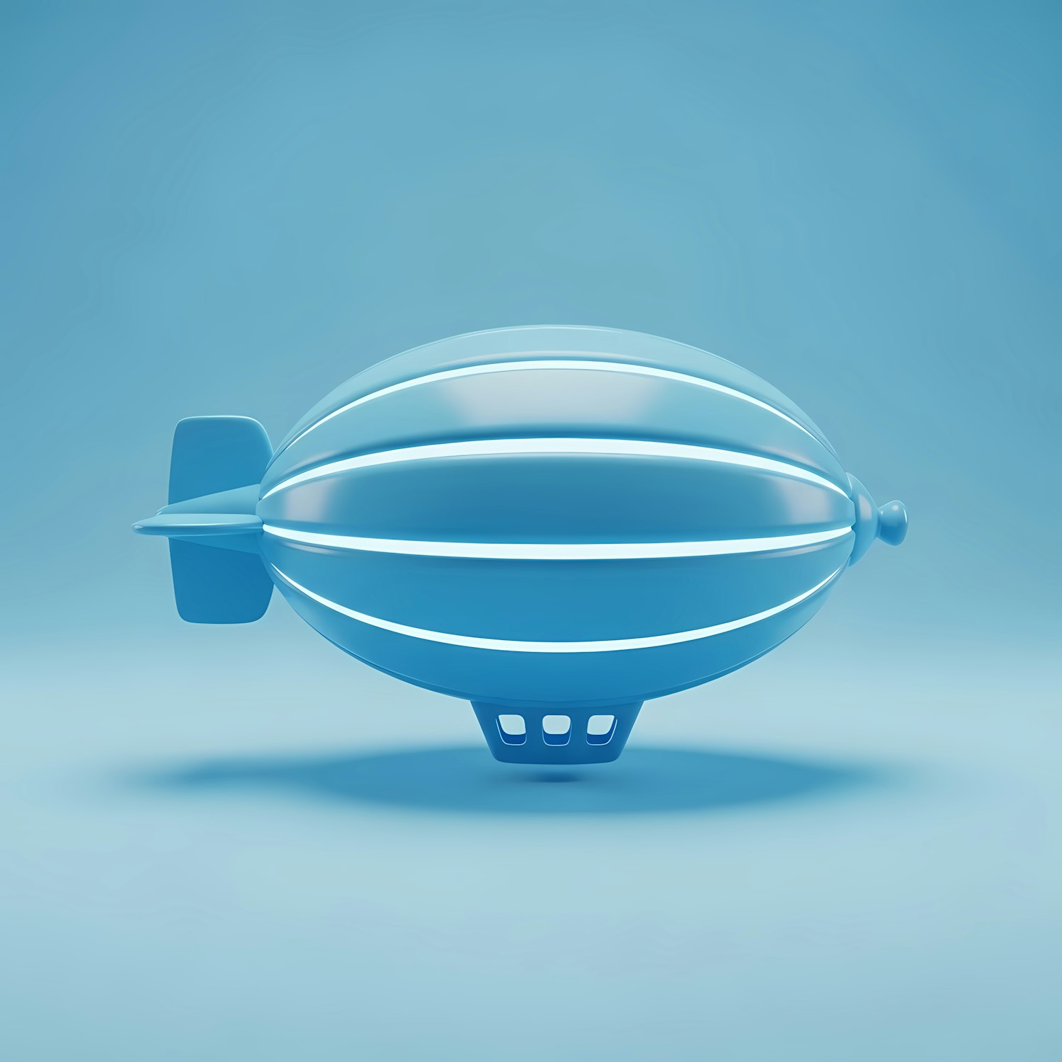Minimalistic 3D rendering of a blue airship with a sleek design, set against a gradient blue background. Perfect for modern design themes.