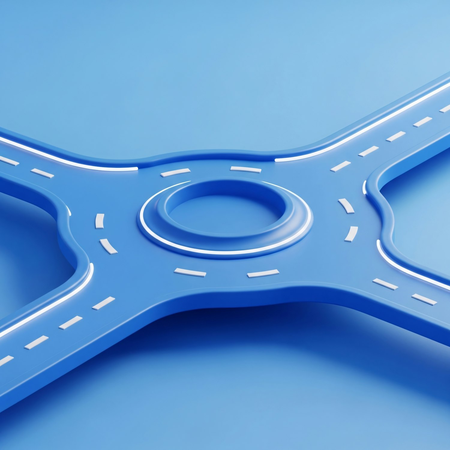 Stylized 3D rendering of a blue roundabout with four roads, featuring clean lines and a minimalistic design.
