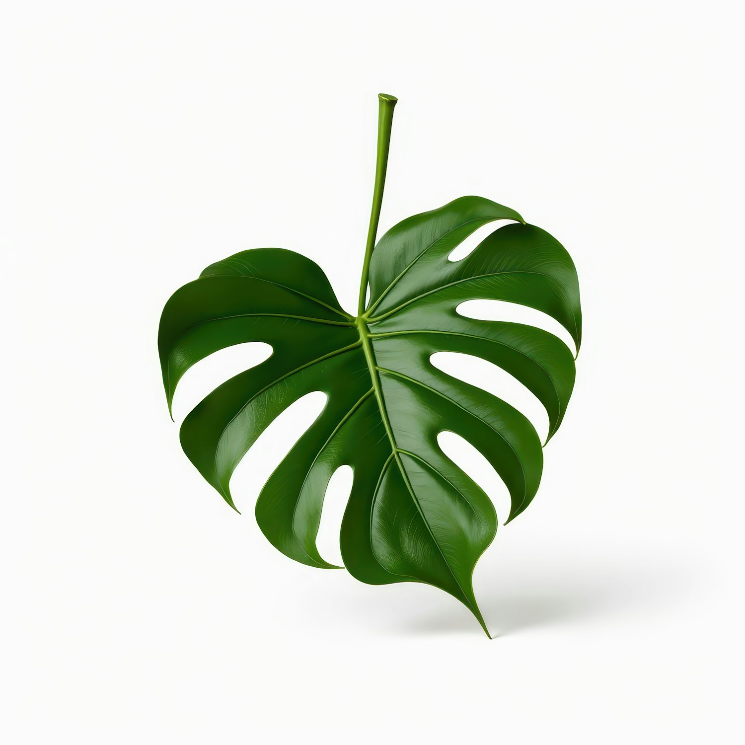 Vibrant green Monstera leaf with natural splits on a plain white background, highlighting its glossy texture and intricate veins.