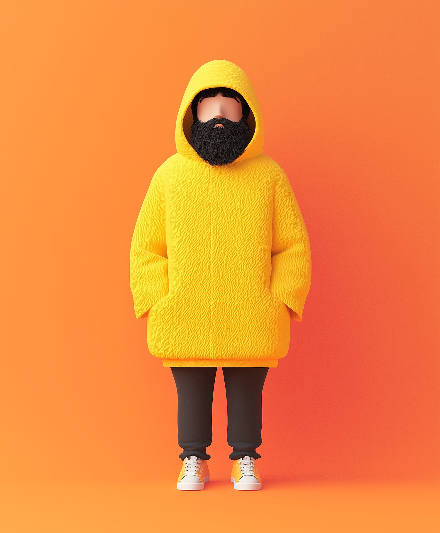 Stylized 3D character in a yellow hoodie with a black beard, set against a vibrant orange background.