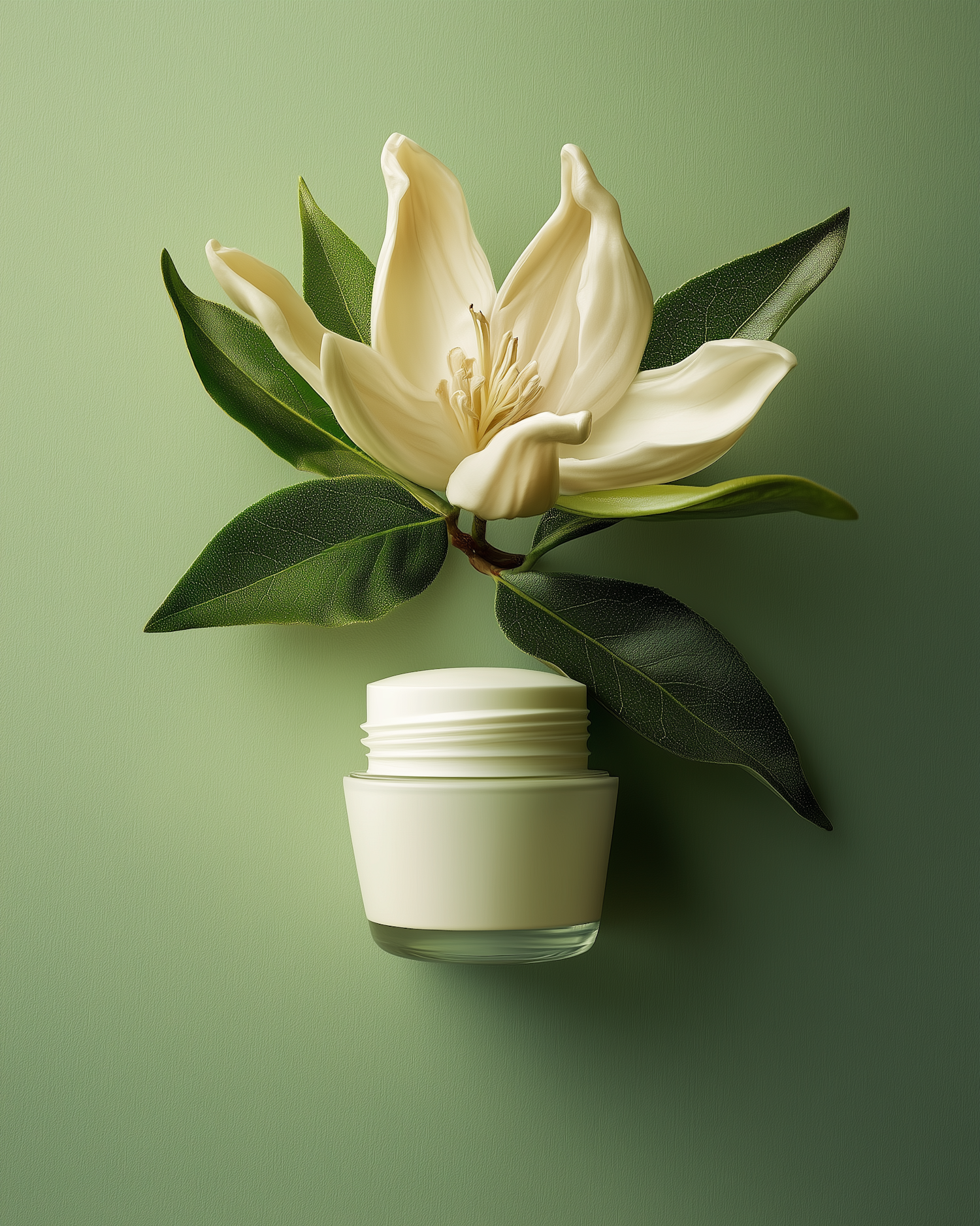 Elegant cream jar with a delicate flower and lush leaves on a soft green background, exuding purity and natural beauty.