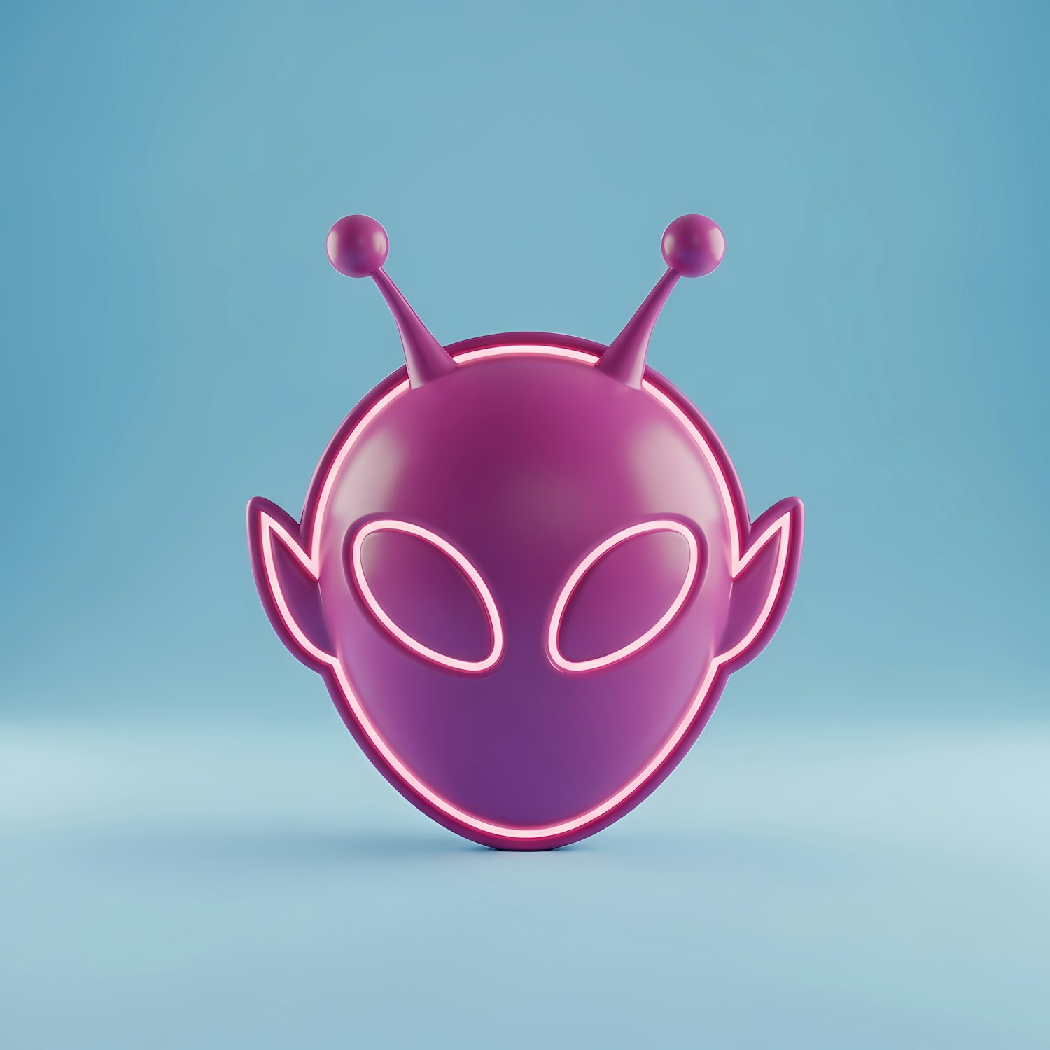 Vibrant 3D alien face with glowing neon outlines, set against a light blue background. Perfect for sci-fi or futuristic themes.