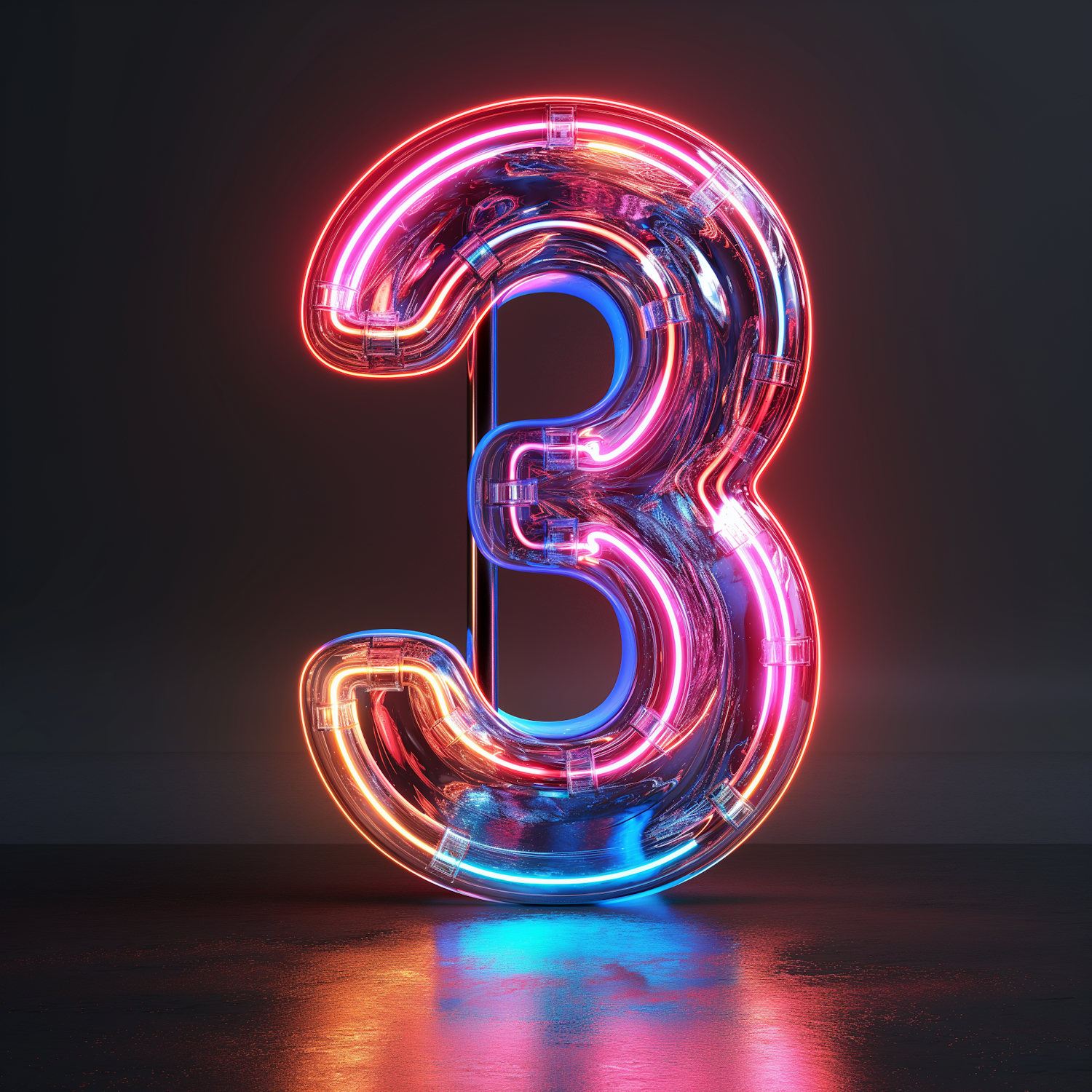 Vibrant 3D neon number '3' with pink, blue, and orange lights on a dark background, creating a striking and modern visual.