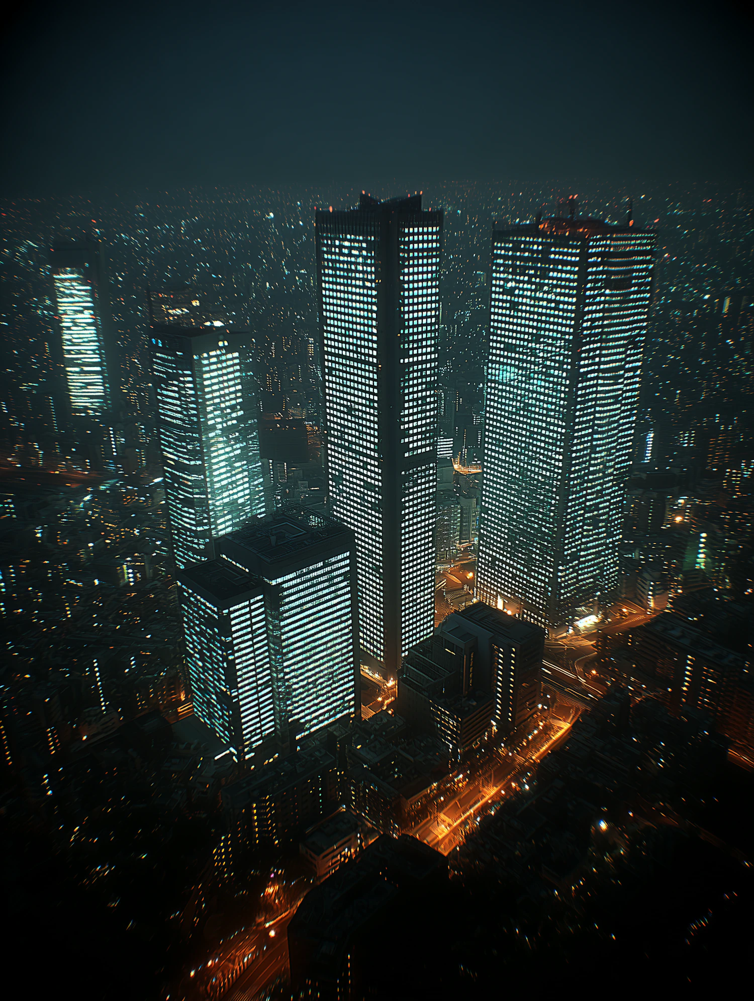 A vibrant nighttime cityscape with illuminated skyscrapers and glowing streets, showcasing the energy of a bustling metropolis.