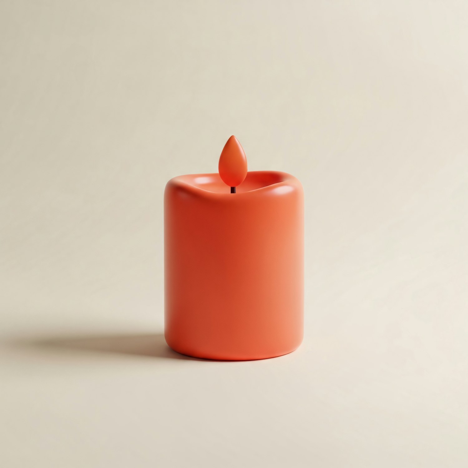 A sleek orange candle with a flame-shaped decoration on a neutral beige background, perfect for modern decor inspiration.