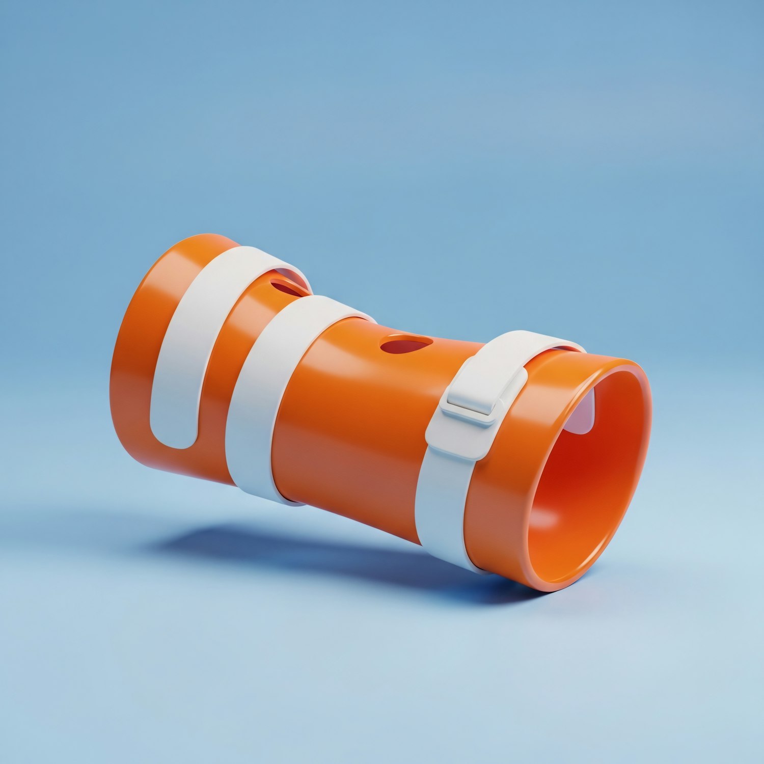 A bright orange cylindrical object with white straps and buckles, set against a light blue background, showcasing a sleek and modern design.