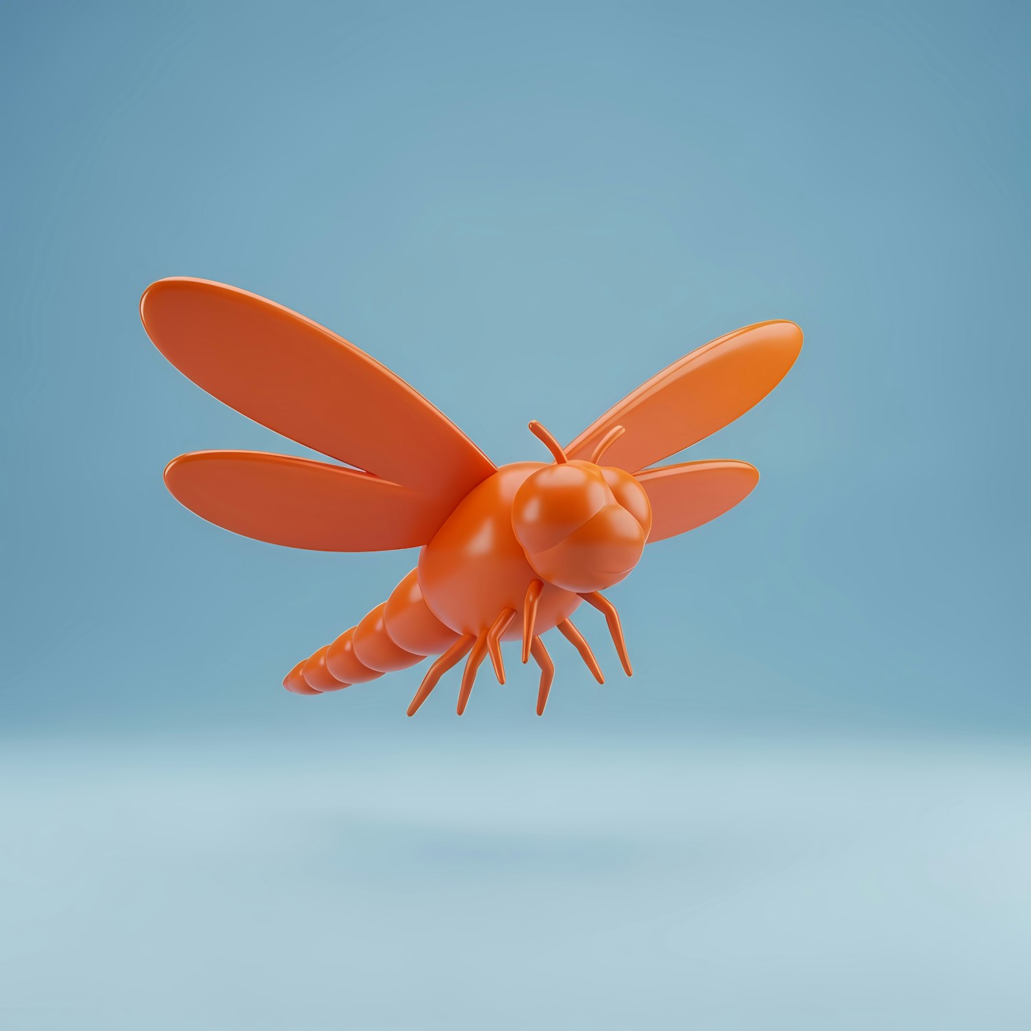 A vibrant orange 3D dragonfly model hovering against a gradient blue background, showcasing smooth, stylized design and glossy finish.