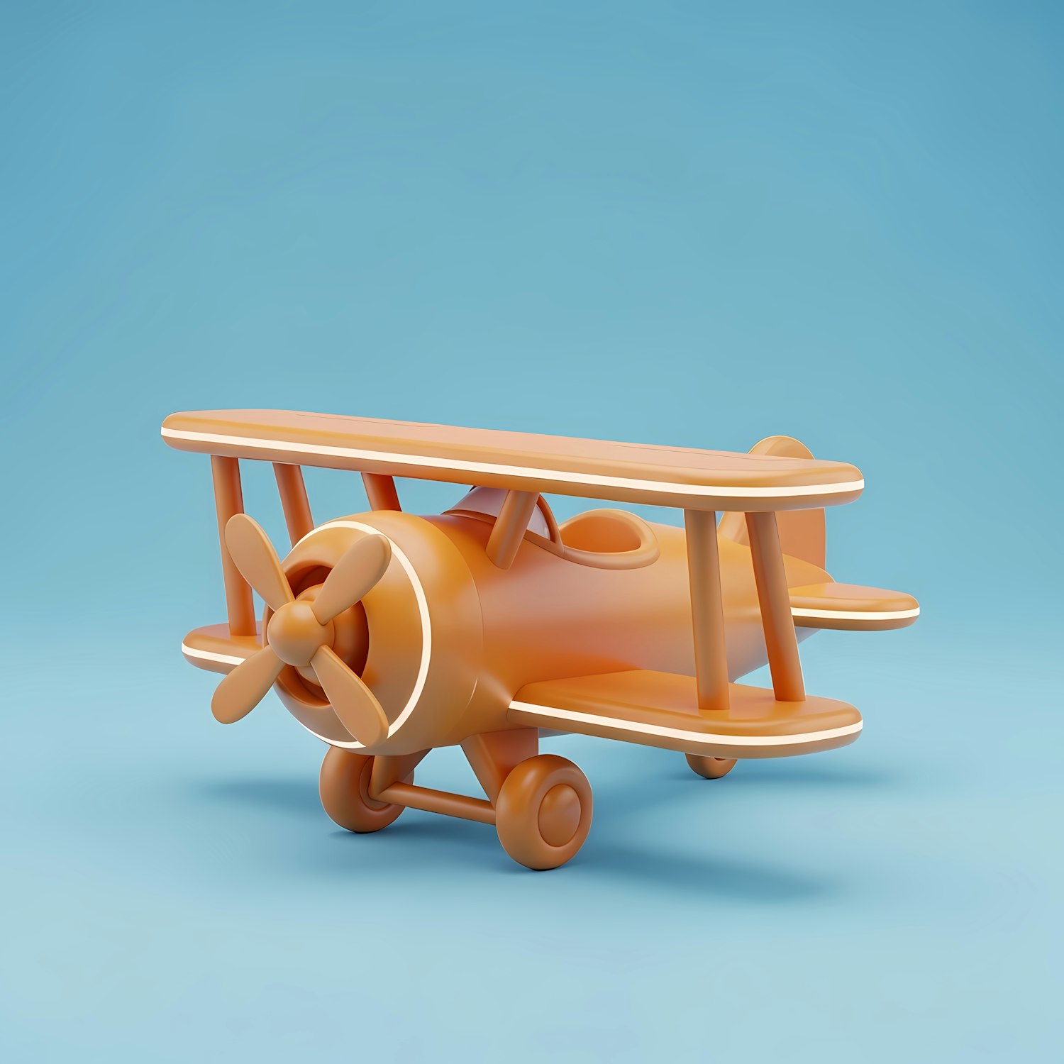 Bright orange toy biplane with white accents in a clean 3D render, set against a light blue background. Perfect for kids' themes.