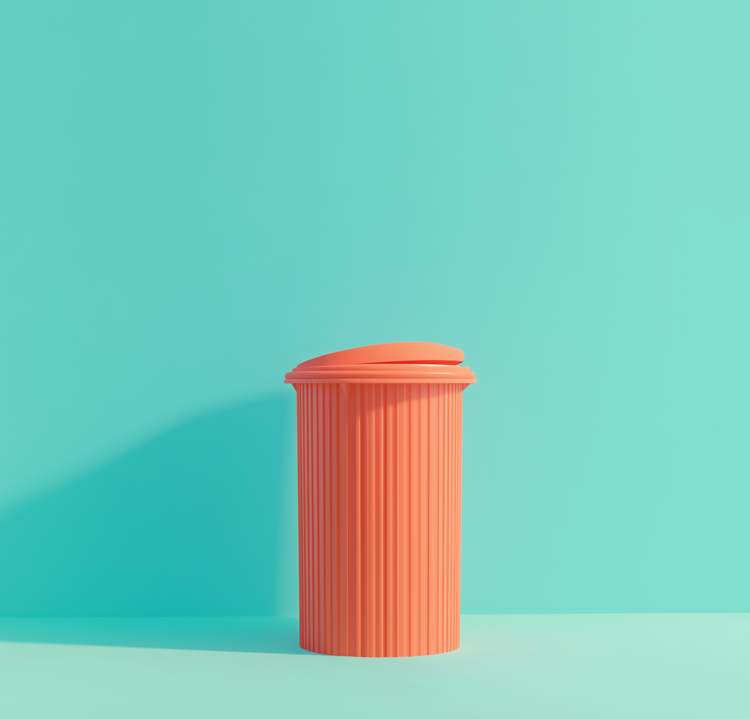 Bright orange trash can against a turquoise background, showcasing modern design and vibrant color contrast.