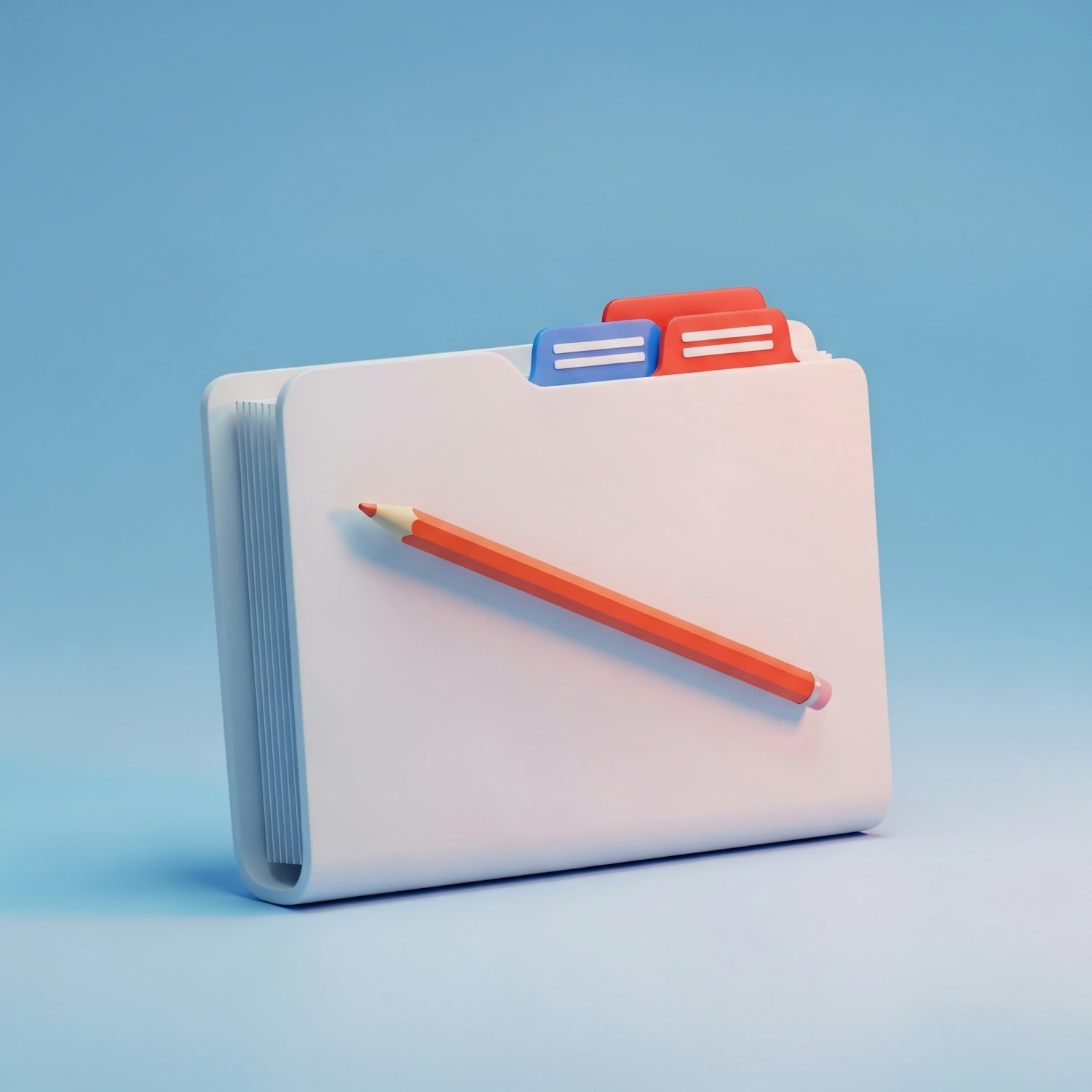 A clean 3D illustration of a white folder with colorful tabs and a red pencil, set against a light blue background.