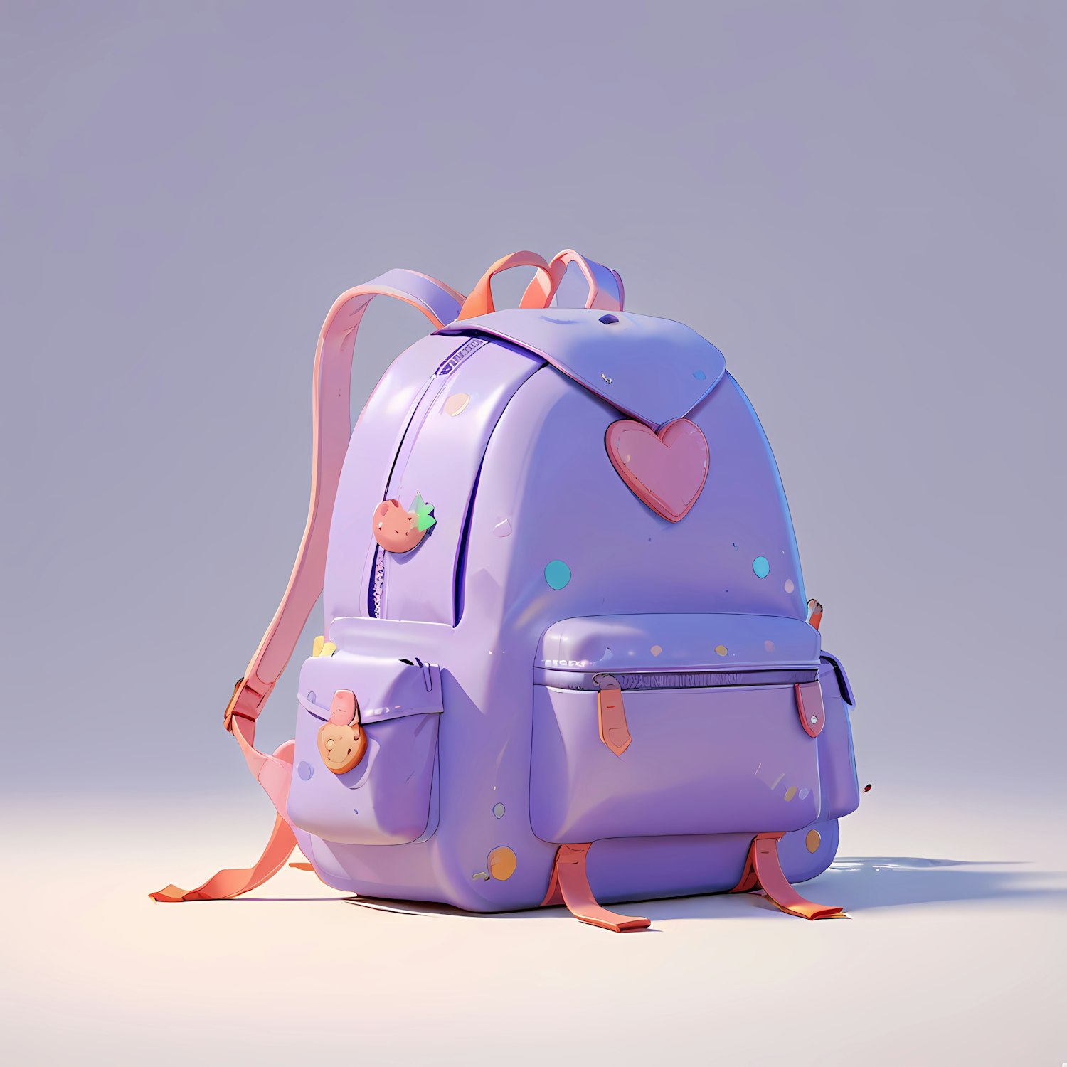 Vibrant purple backpack with playful patches, including a heart and strawberry, on a neutral background. Youthful and whimsical design.