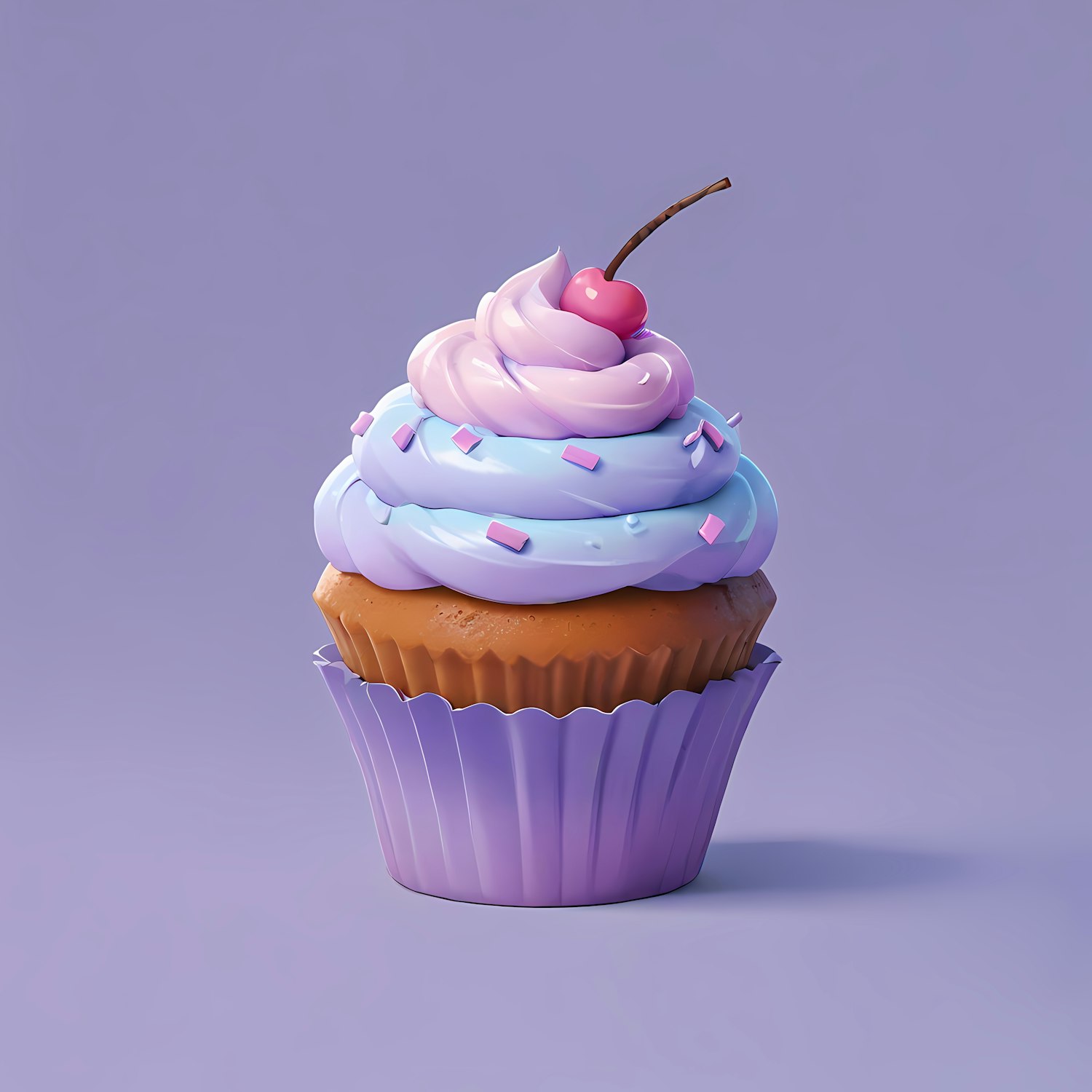 Whimsical cupcake with pastel frosting and a cherry on top, set against a soft purple background. Perfect for dessert lovers.