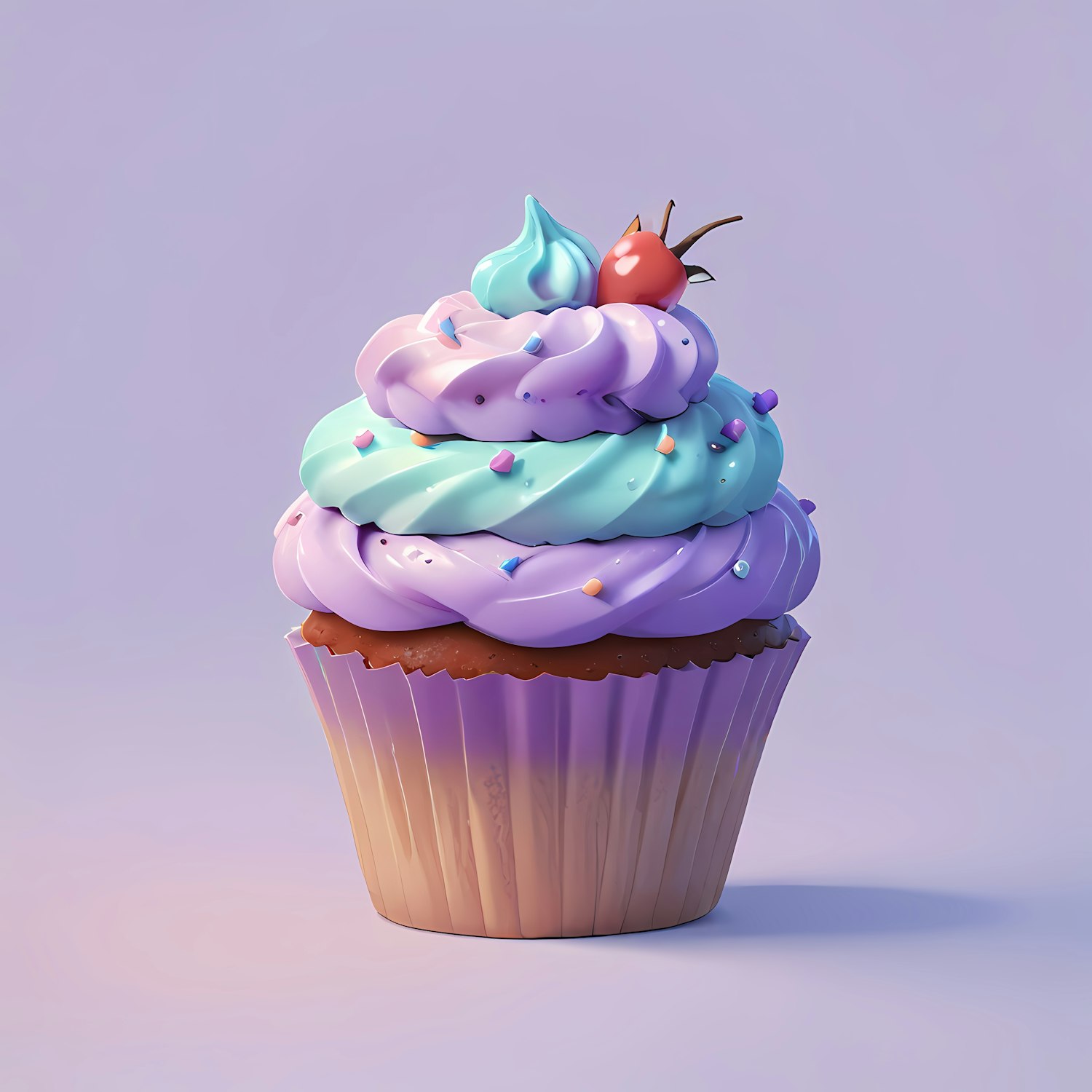 Whimsical cupcake with pastel frosting, colorful sprinkles, and a cherry on top against a soft purple background.