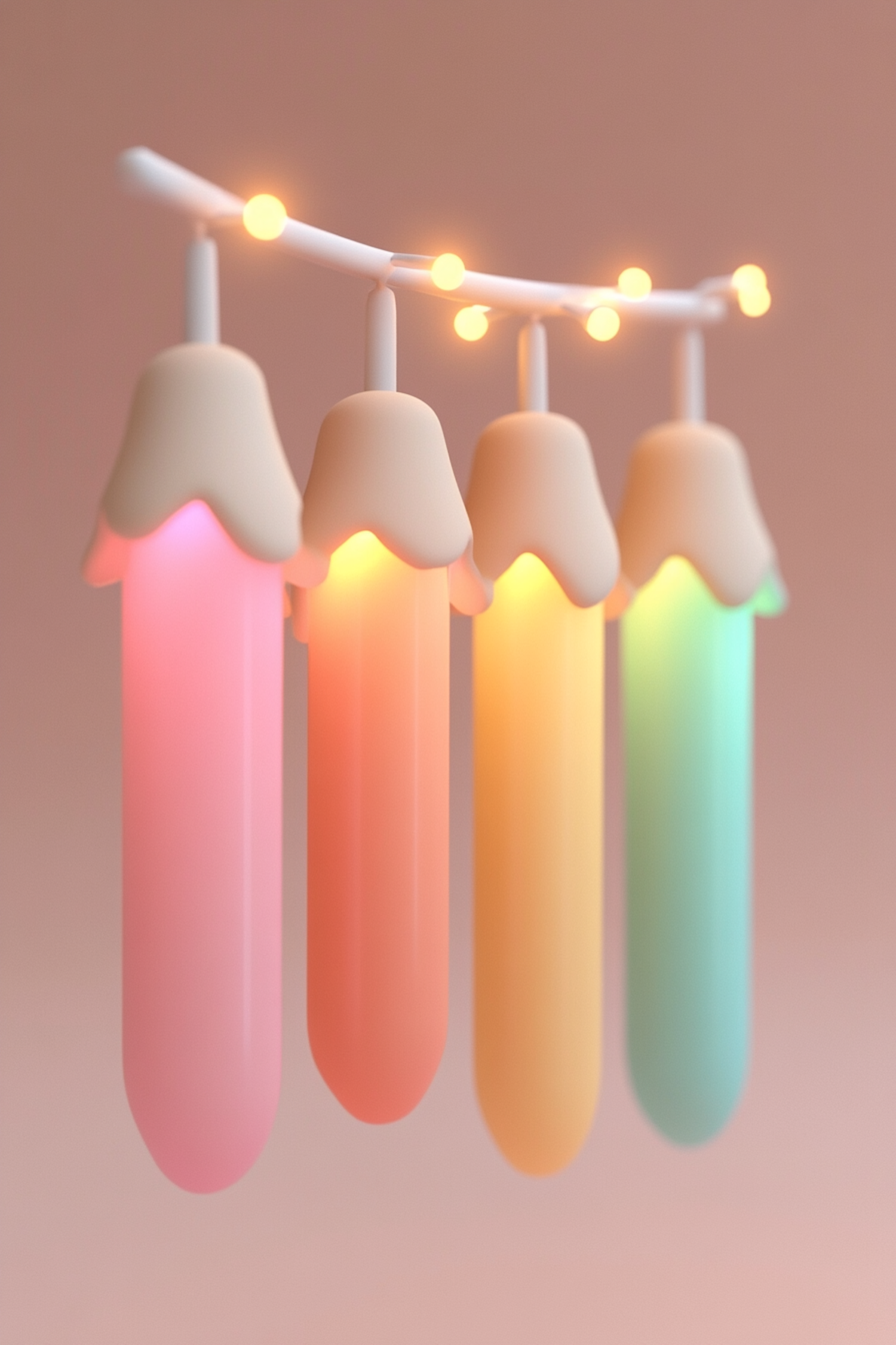 Whimsical pastel pendant lights resembling popsicles with a creamy top, set against a soft pink background.