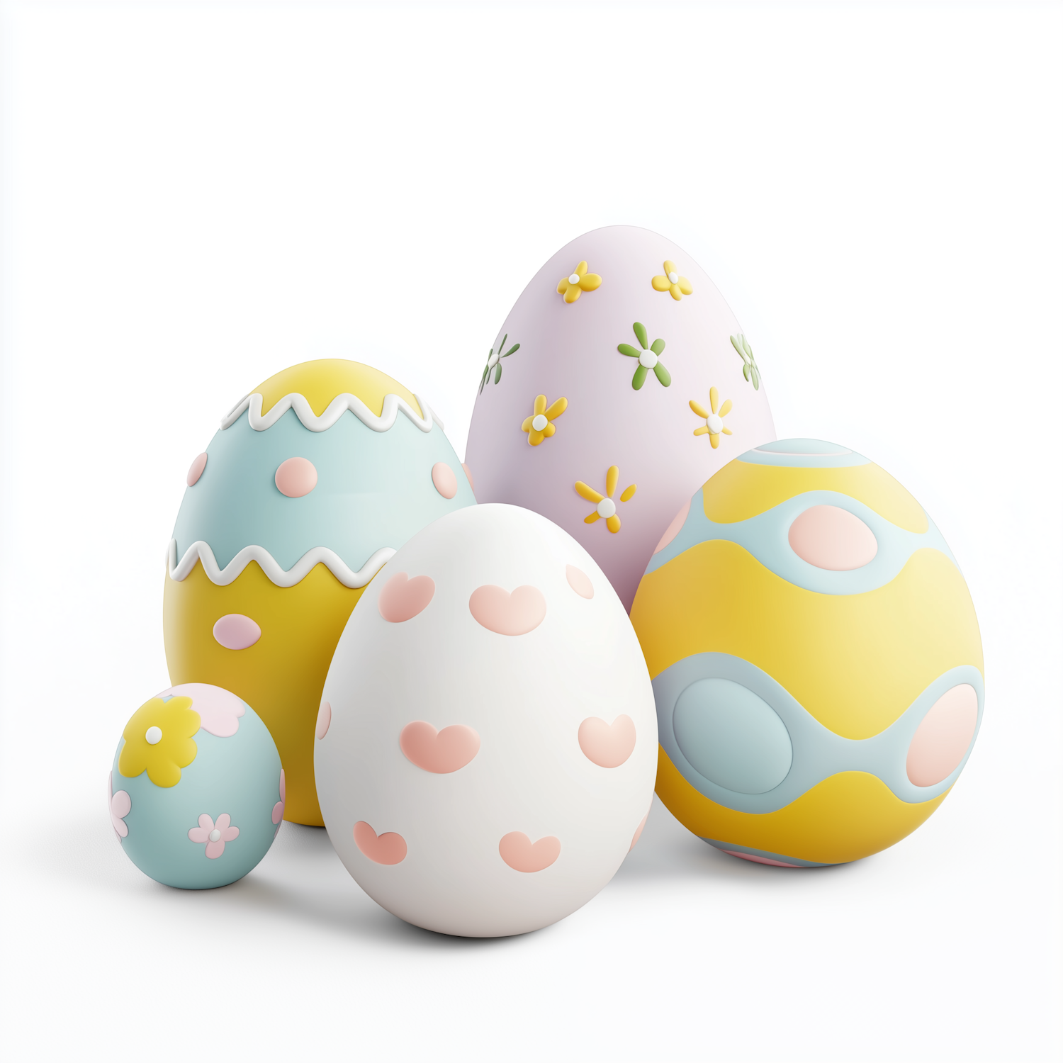 A group of pastel Easter eggs with floral, heart, and wavy patterns, perfect for spring or Easter-themed designs.