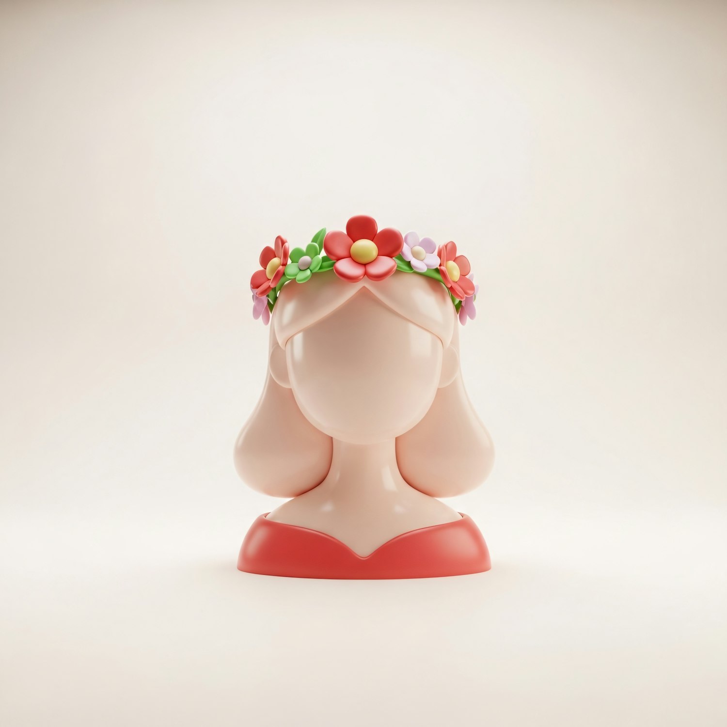 A 3D-rendered bust with a flower crown and a red top, featuring a smooth, minimalistic design against a neutral background.