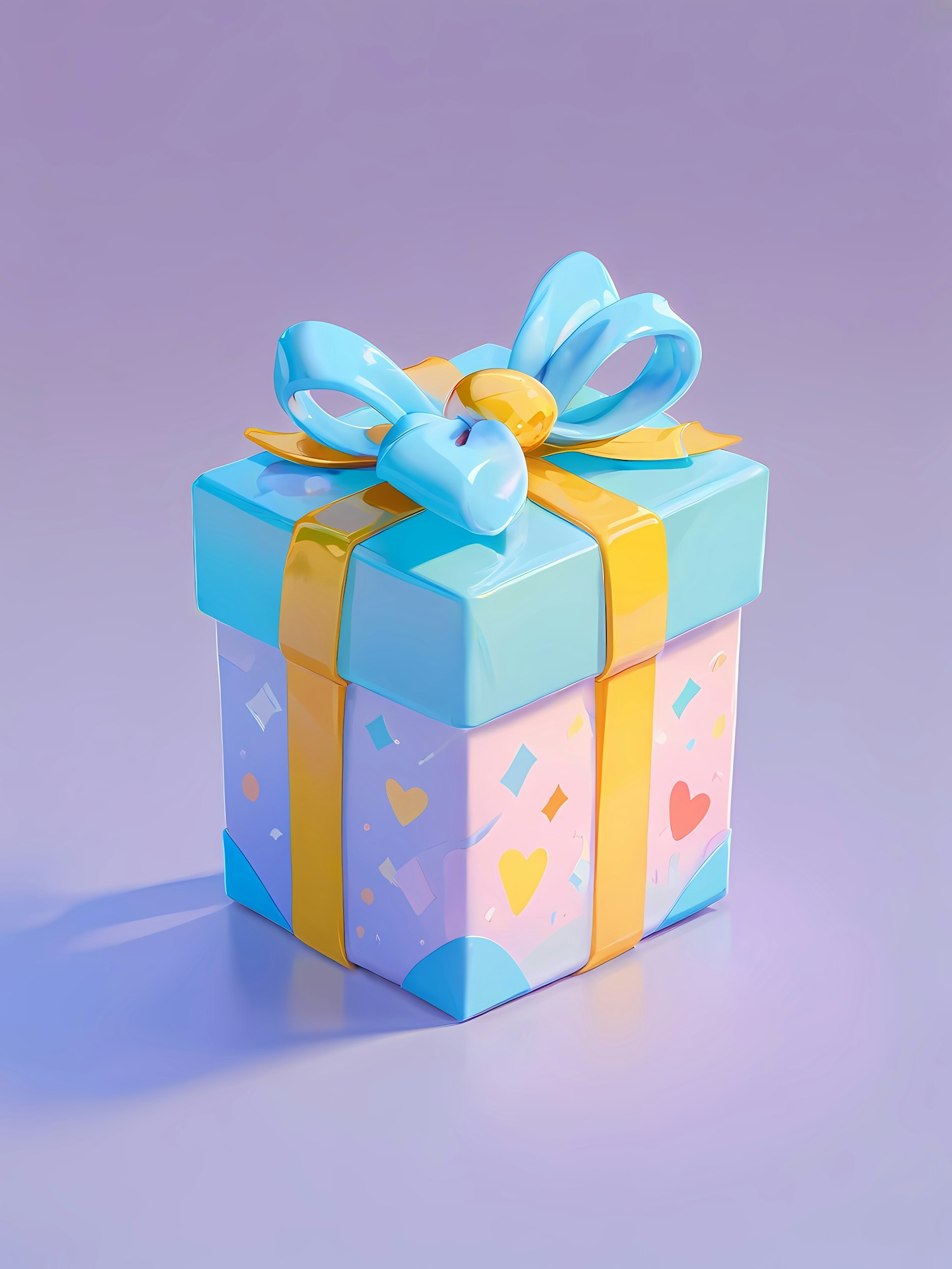 A colorful 3D gift box with a blue bow, yellow ribbon, and heart patterns on a pastel pink background. Perfect for celebrations!