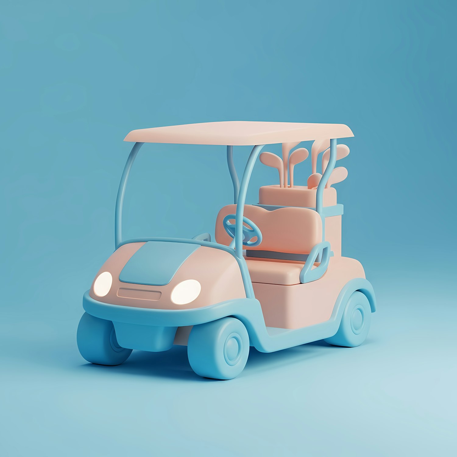 A pastel-colored 3D golf cart with a playful design, featuring golf clubs in the back and a clean blue background.