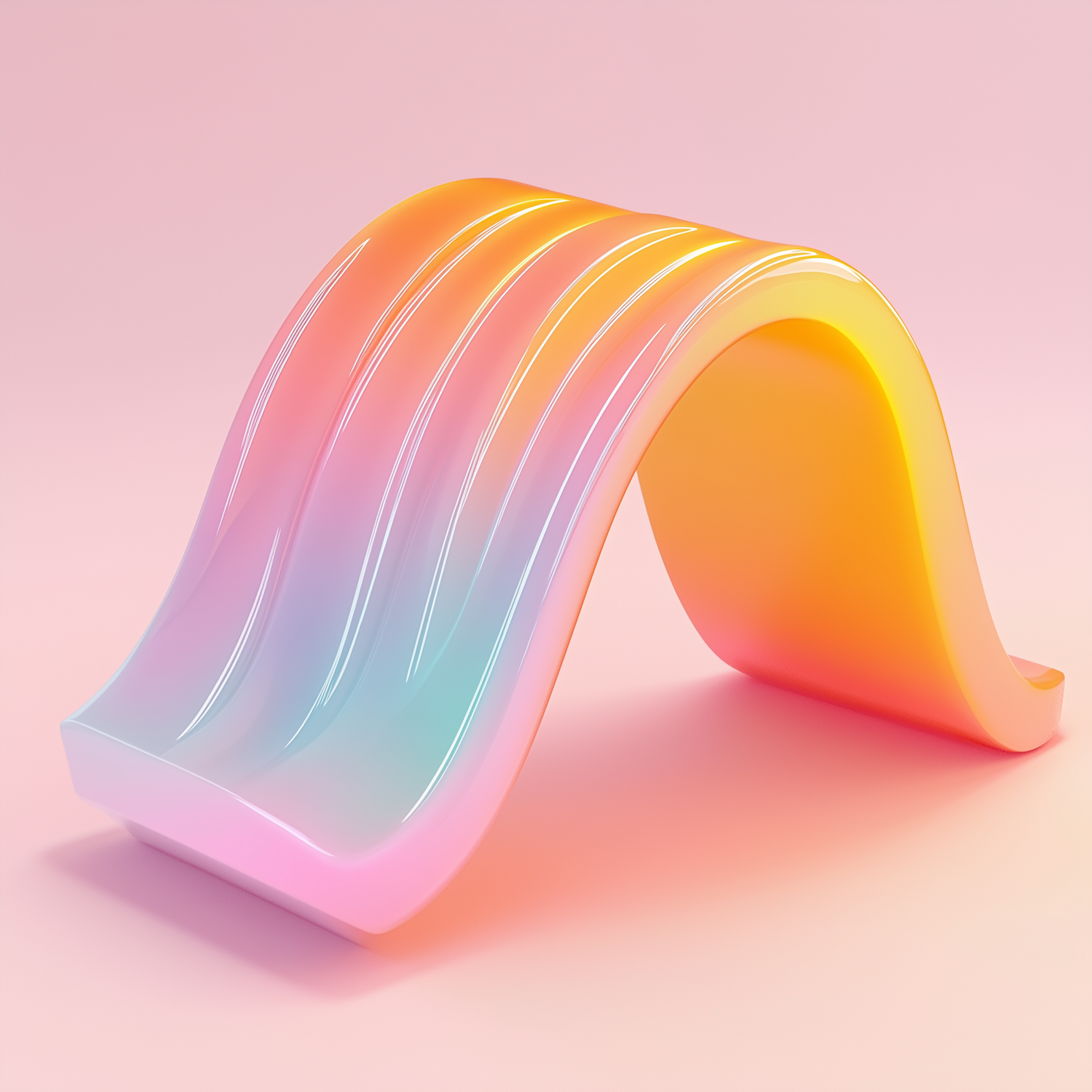 A glossy, pastel-colored wavy 3D structure with a pink background, blending soft hues of pink, orange, yellow, and blue.