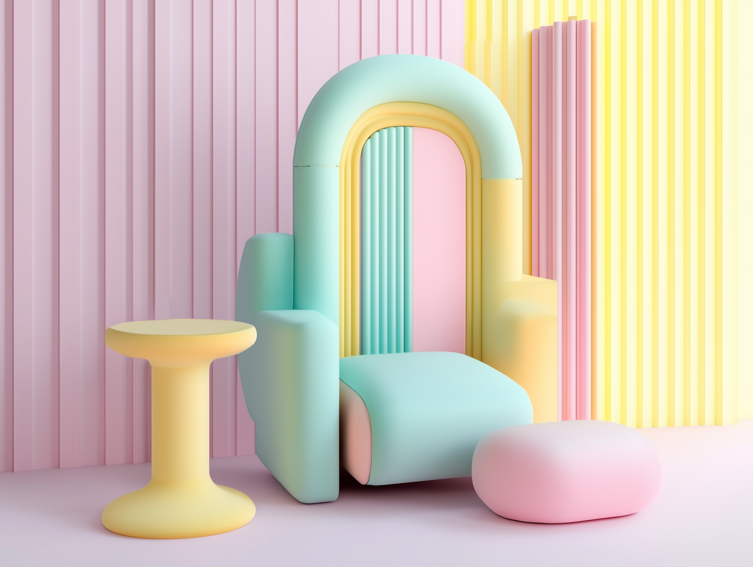 Playful pastel furniture setup with a mint, yellow, and pink armchair, matching ottoman, and yellow side table against a striped backdrop.