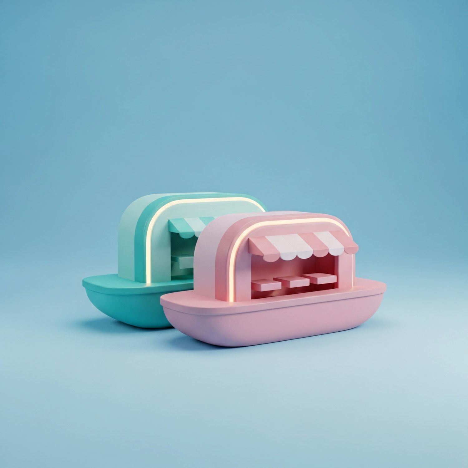 Two pastel-colored miniature kiosks with rounded designs and awnings, set against a soft blue background, creating a playful scene.