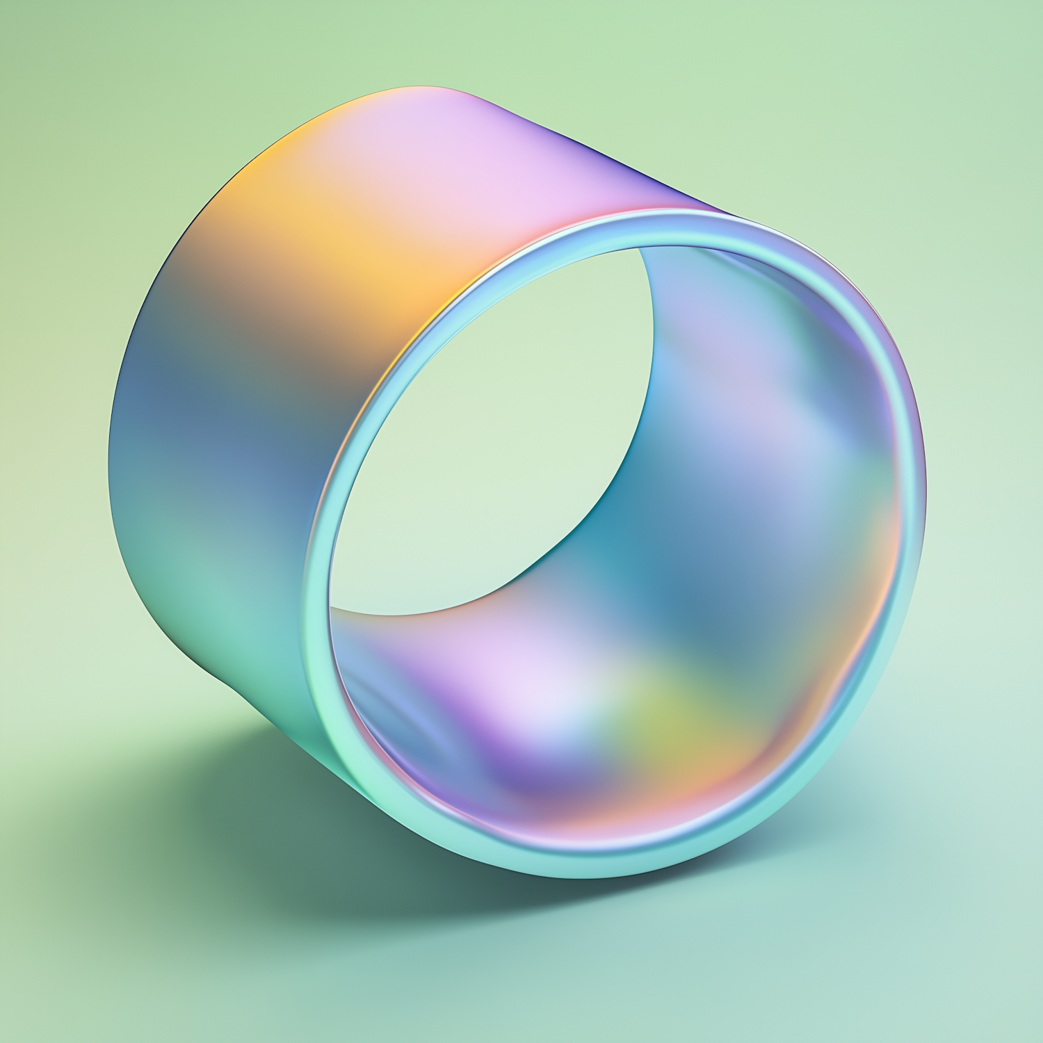 A 3D-rendered metallic torus with pastel gradients and an iridescent glow, set against a minimalistic light green background.