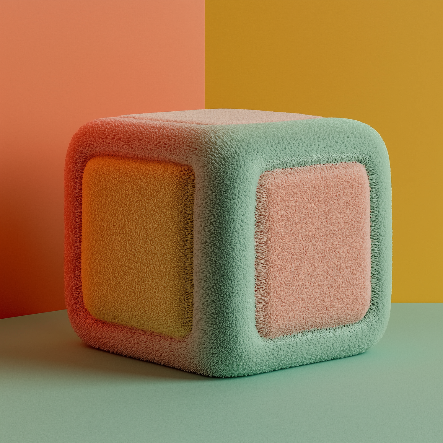 A soft, fuzzy 3D cube in pastel green, peach, and yellow against a vibrant orange and yellow background. Modern and playful design.