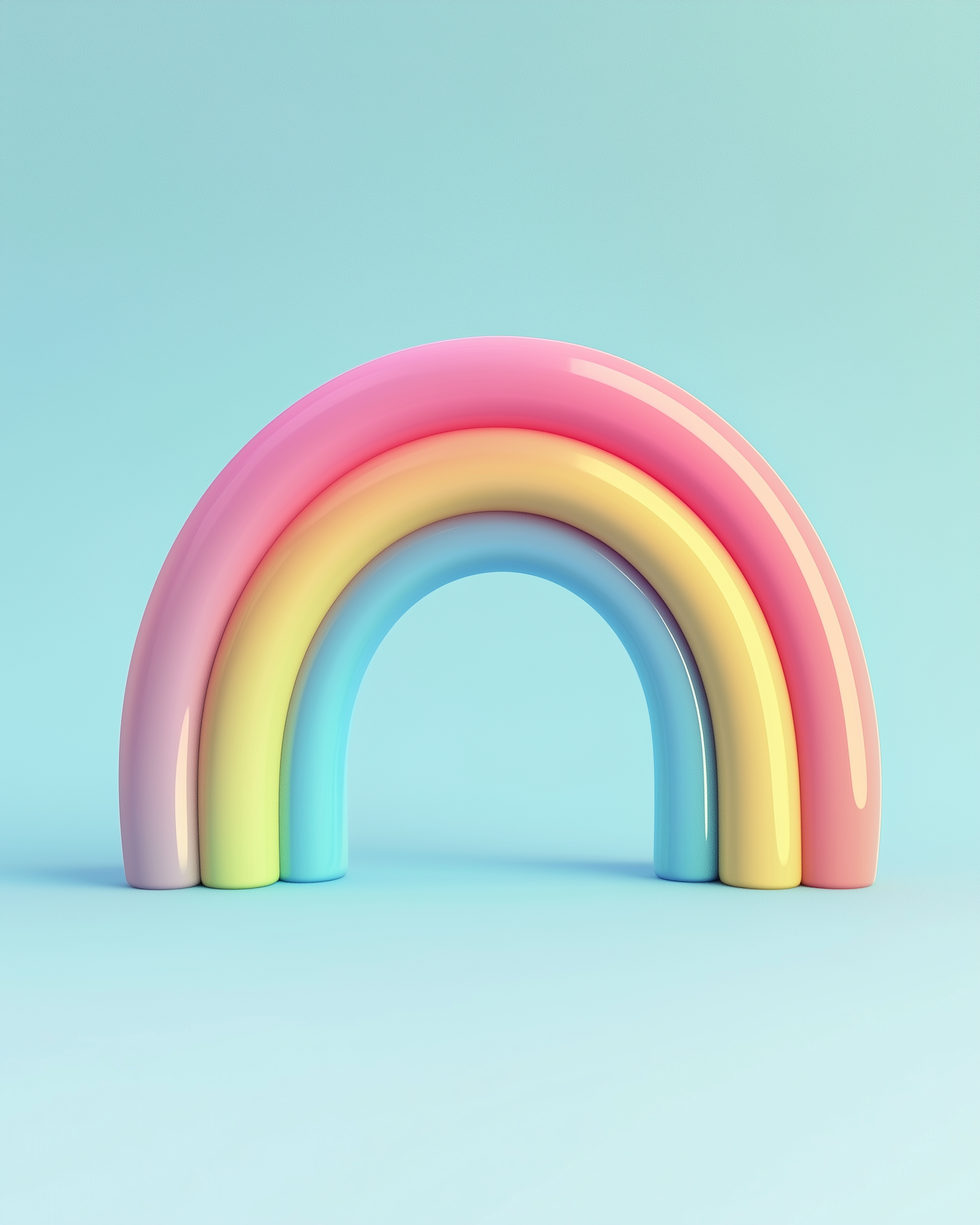 A glossy pastel rainbow with pink, yellow, and blue arches on a light teal background. Minimalist and cheerful 3D design.